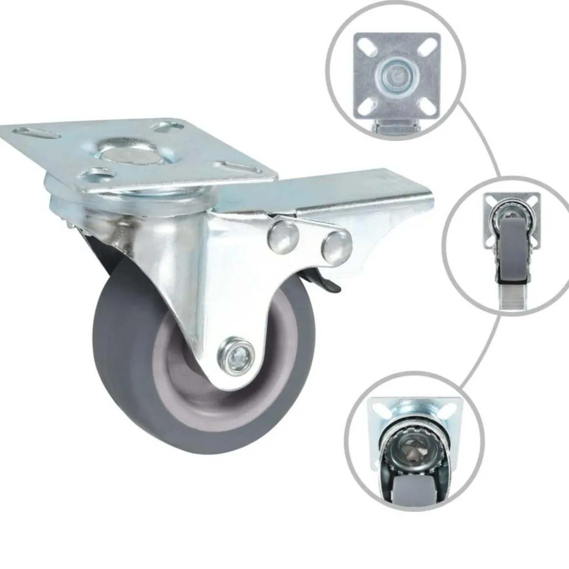 Ces roulettes sont fabriquees en TPR (caoutchouc thermoplastique) qui se distingue par une bonne resistance aux chocs et aux vibrations, permettant a ces roulettes de fonctionner en douceur et en silence. De plus, leurs surfaces douces protegent efficacement votre sol des egratignures. En outre, le cadre en fer zingue est hautement resistant a la rouille et ajoute ainsi a la robustesse et a la durabilite de la roulette pivotante. Ces roulettes pivotantes sont equipees de freins pour controle flexible. Chaque roulette pivotante a une capacite de charge maximale de 35 kg.