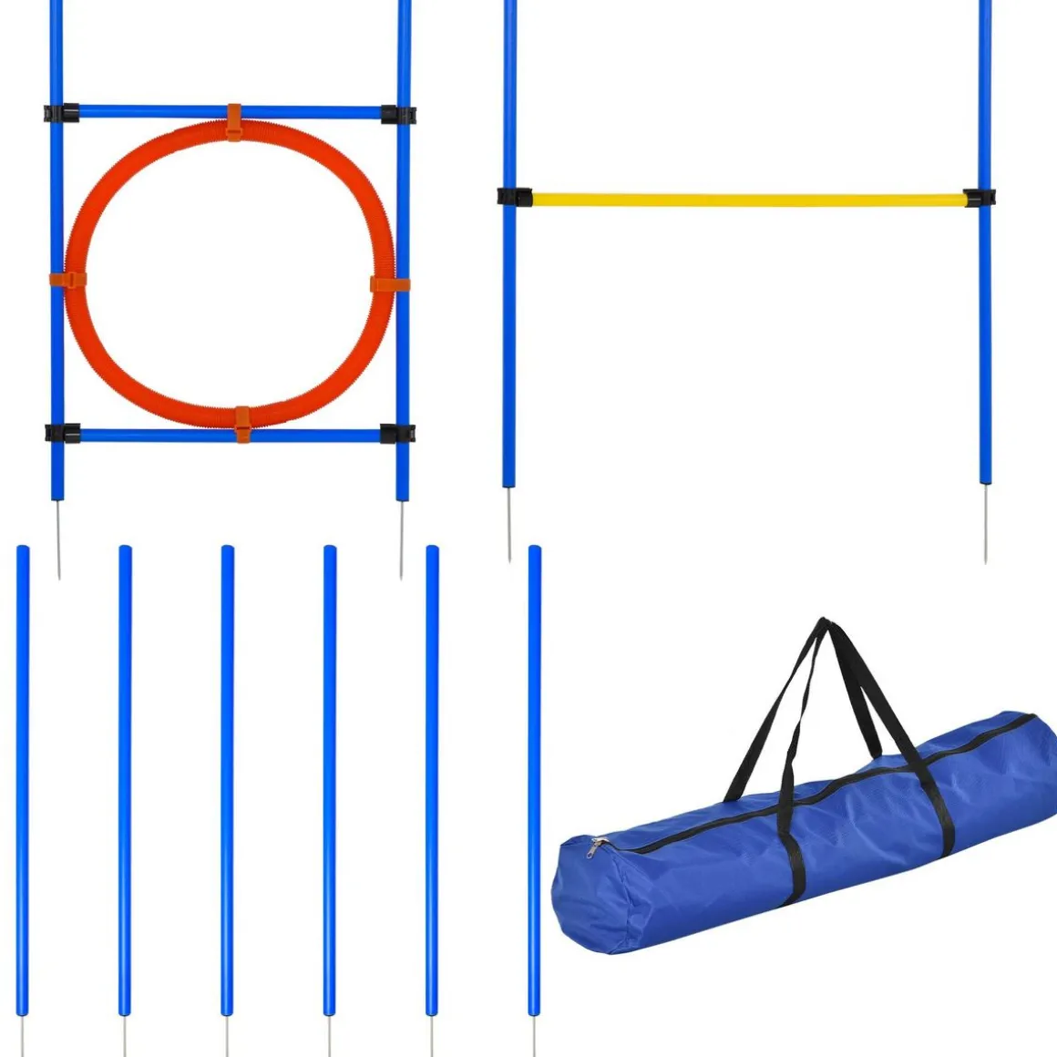 – Equipement complet Agility sport pour chiens composé de 6 poteaux de slalom, d’un obstacle, d’un anneau avec sac de transport