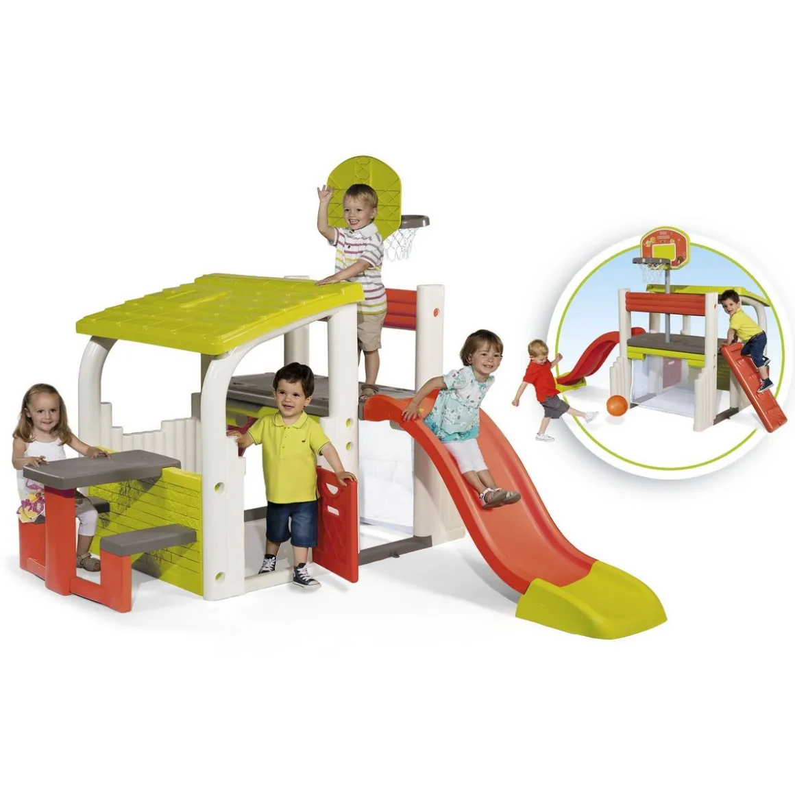 Vos enfants rêvent d’une aire de jeux dans le jardin ? Adoptez vite ce Fun center de Smoby. C’est une aire de jeux idéale pour jouer et se dépenser, les enfants vont adorer l’avoir à disposition afin d’y jouer toute la journée. L’aire de jeu Fun Center se divise en deux parties : Le coin maison comprenant un portillon, un coin repas et un toit tissu imprimé ainsi qu’un espace multi-sport composé d’un toboggan, 1 panier de basket, 1 cage de foot et un mur d’escalade !