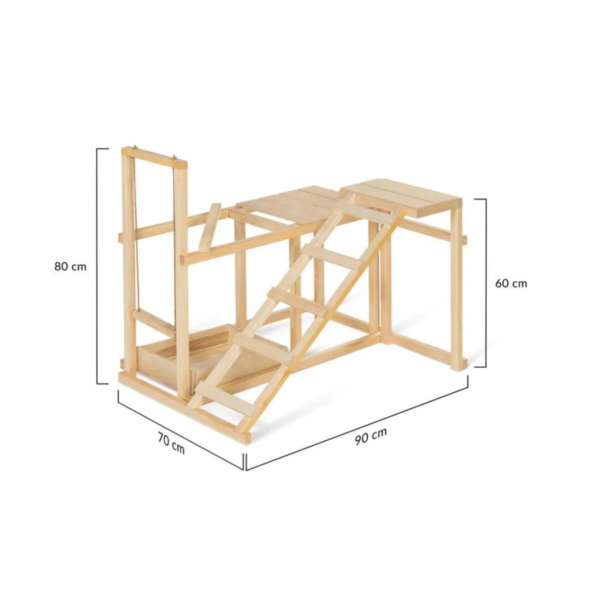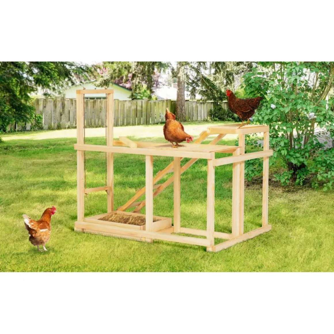 Aire de jeux pour poules tout en un en bois de qualité. Idéale pour occuper les poules et les maintenir en bonne forme. Cette aire de jeux s’intègre parfaitement dans un enclos en complément du poulailler.