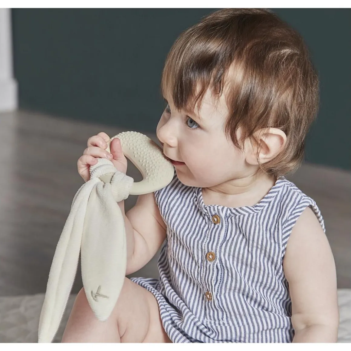 anneau de dentition en caoutchou avce oreilles de lapin en tissu.