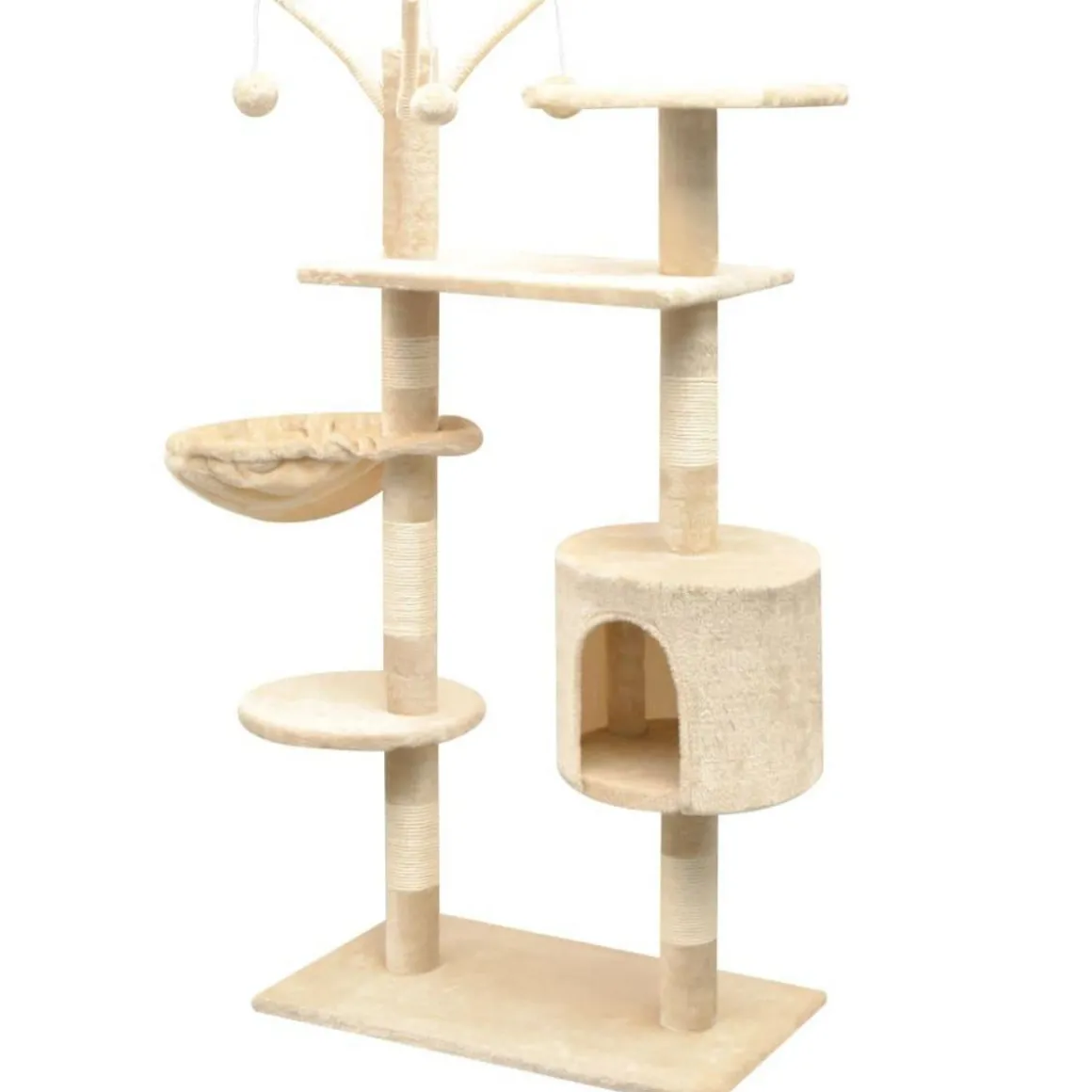 Vos amis felins peuvent aiguiser leurs griffes sur les griffoirs enroules dans des cordes en sisal, qui fournit une bonne pratique pour leurs instincts a gratter. Ils aimeront egalement courir apres l’autre tout en sautant de haut en bas dans ce centre de jeu amusant. Au sommet de l’arbre a chat, il y a des jouets suspendus qui vont eveiller vos chats curieux. Quand ils s’amusent suffisamment, vos petits amis adoreront se reposer sur les plates-formes superieures, ou ils auront une meilleure vue. Ils peuvent egalement se cacher dans la maison confortable pour faire une sieste, ou se detendre sur le hamac douillet.