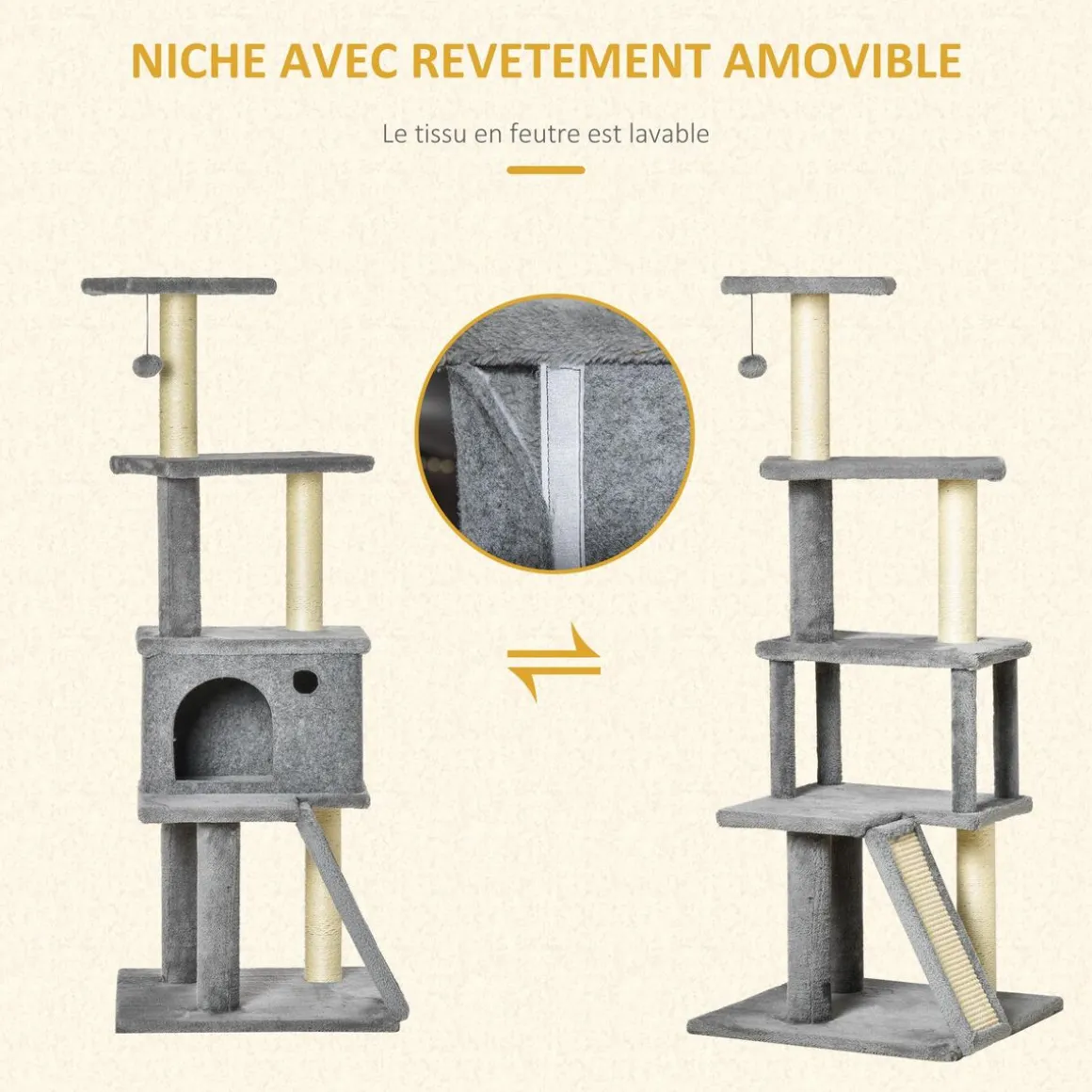 – Multi-équipement : grande niche avec housse amovible, 4 plateformes dont une haute d’observation, grattoir, griffoirs, jouet boule suspendue