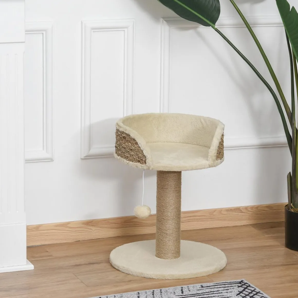 – Arbre à chat style cosy chic mêlant les revêtements en jute tressée, sisal et peluche courte