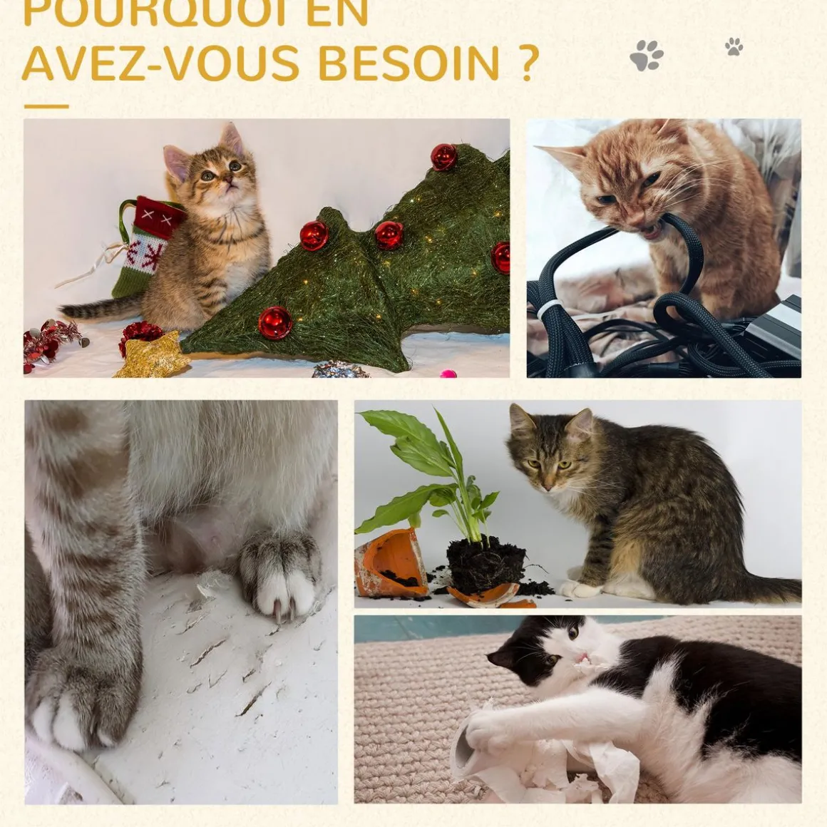 – Arbre à chat centre d’activités variées : griffoir, plateforme d’observation, pompon suspendu permettant à votre chat de jouer, faire ses griffes et de s’étirer