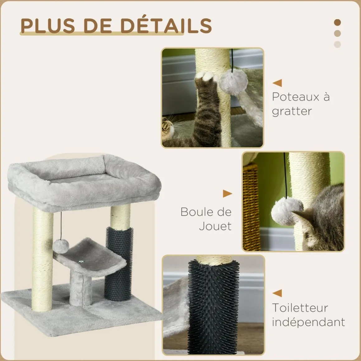 – Arbre à chat centre d’activités variées : 2 griffoirs (dont un doté d’une bande massante), panier d’observation, plateforme, jeu de boule suspendue permettant à votre chat de jouer, faire ses griffes et de s’étirer