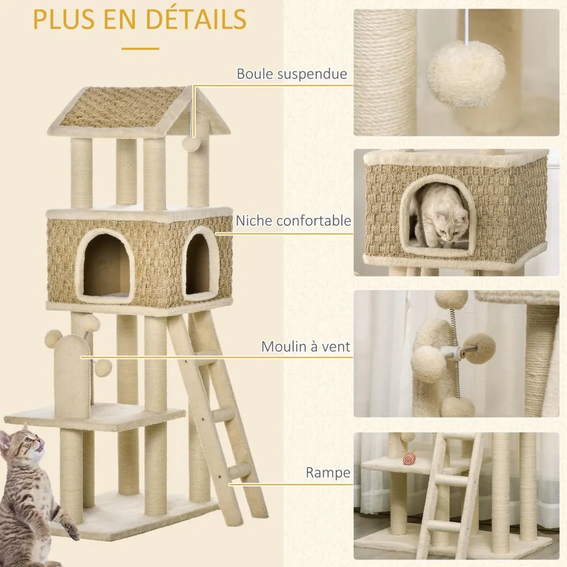 – Arbre à chat centre d’activités variées : griffoirs, grande niche, échelle, plateformes (dont une d’observation avec toit), jeu de boules tourniquet permettant à votre chat de jouer, faire ses griffes et de s’étirer