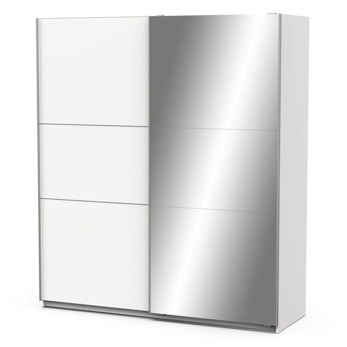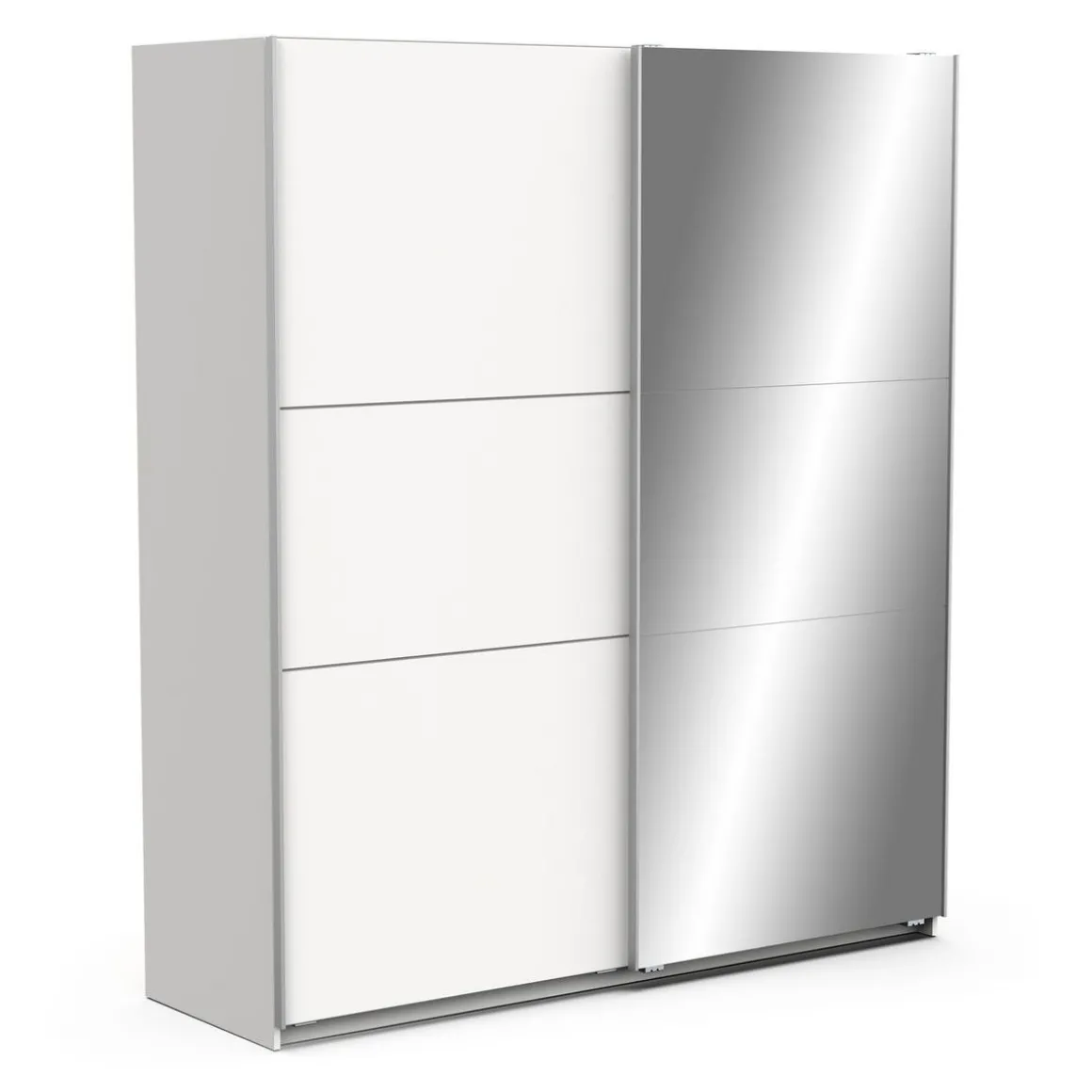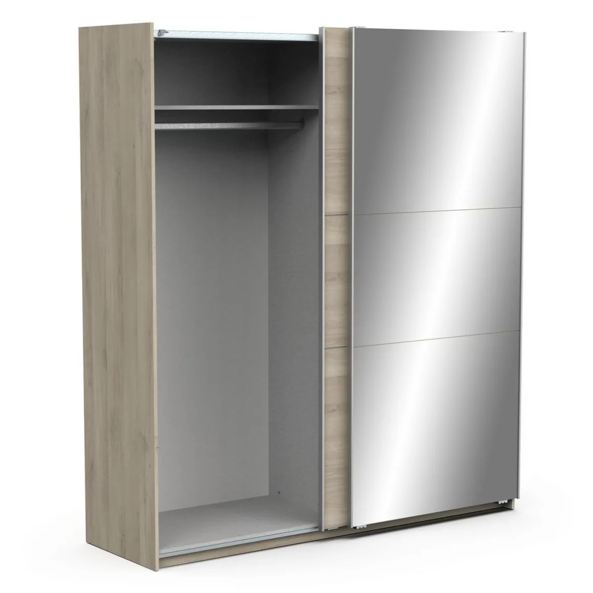Armoire 2 portes coulissantes + miroir, en panneaux de particules 15 et 12mm. Décor papier blanc mat. Dans chaque colonne, 1 barre de penderie (charge maximale : 22kg) + 1 rayon (charge maximale : 14kg).