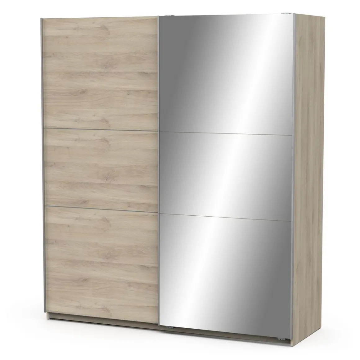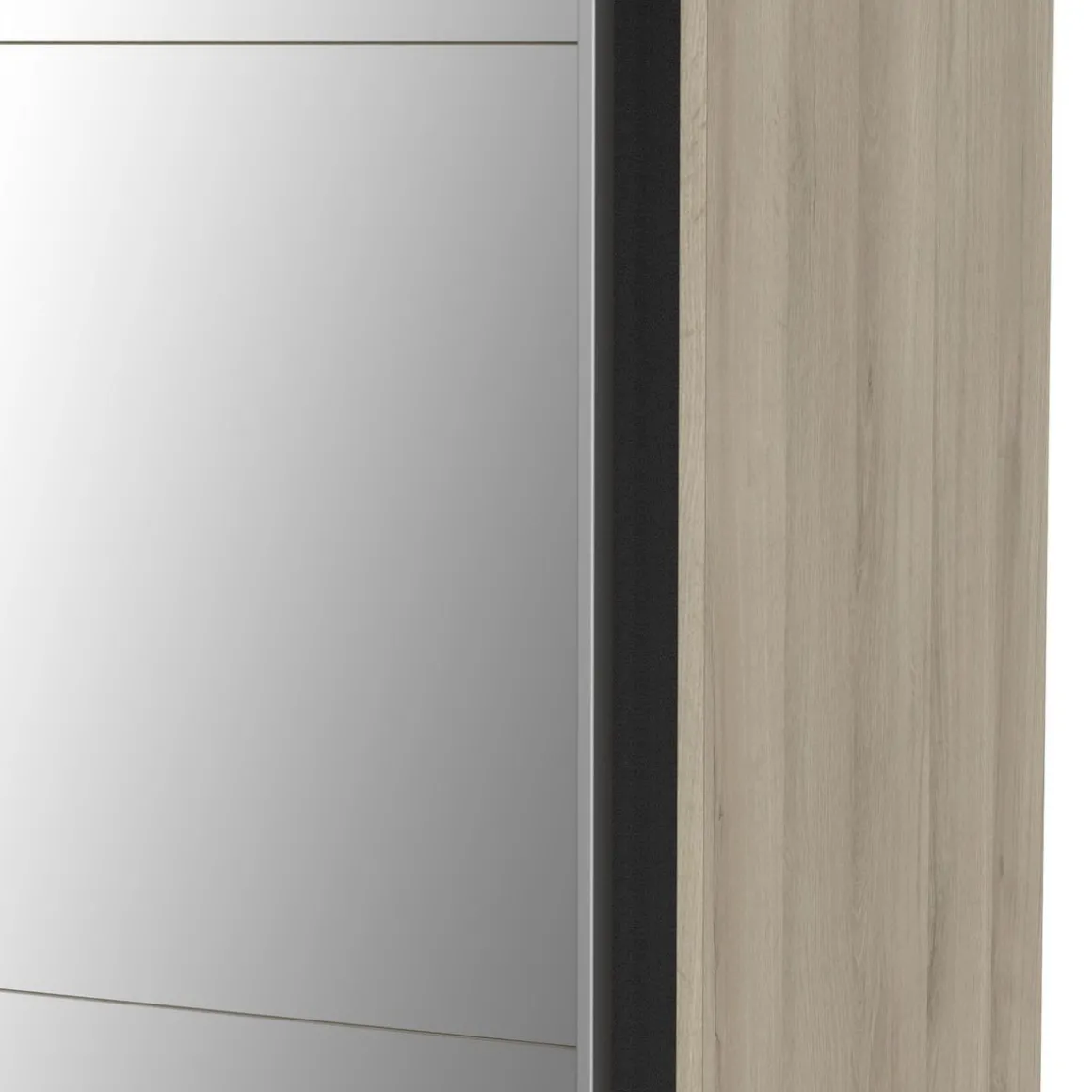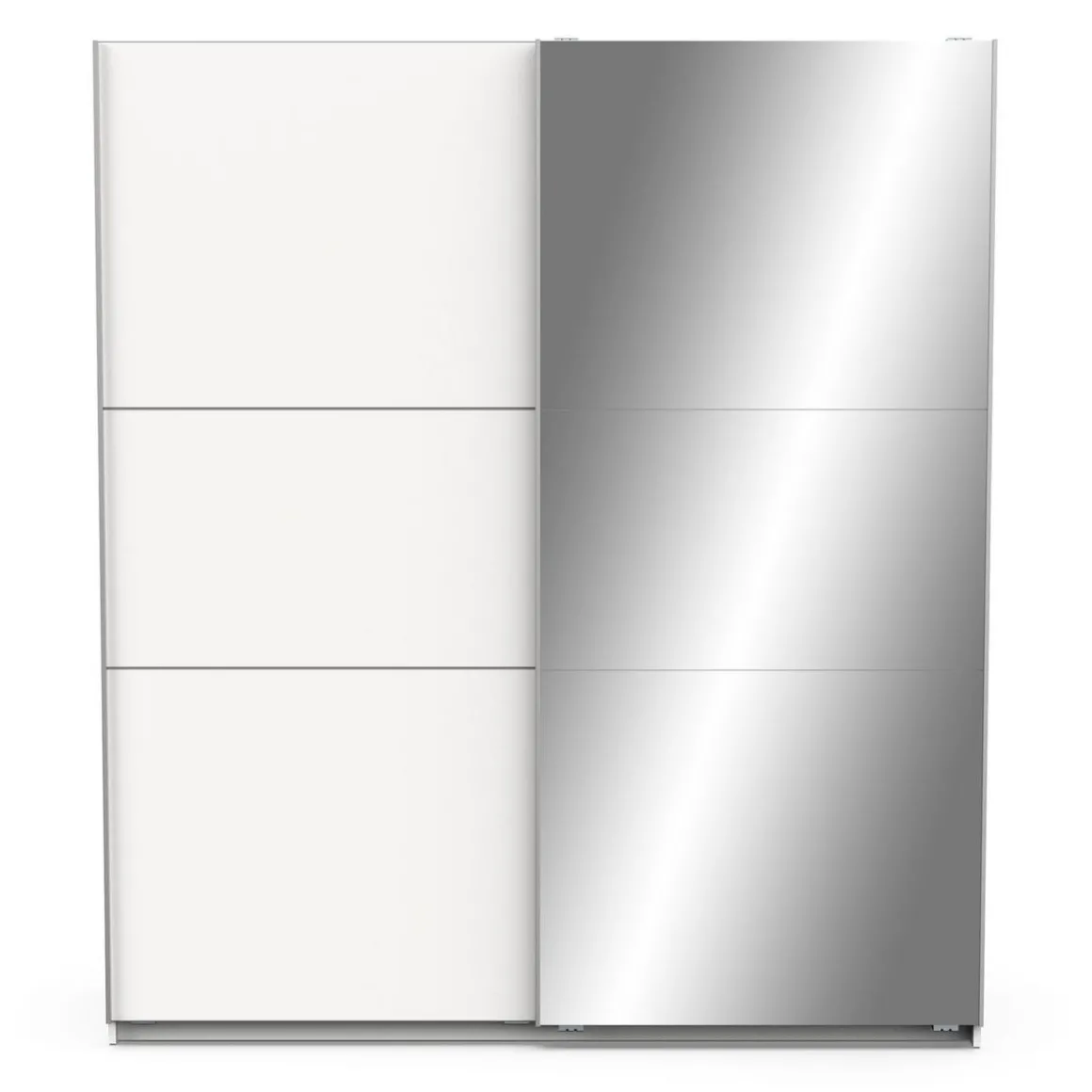 Armoire 2 portes coulissantes + miroir, en panneaux de particules 15 et 12mm. Décor papier blanc mat. Dans chaque colonne, 1 barre de penderie (charge maximale : 22kg) + 1 rayon (charge maximale : 14kg).
