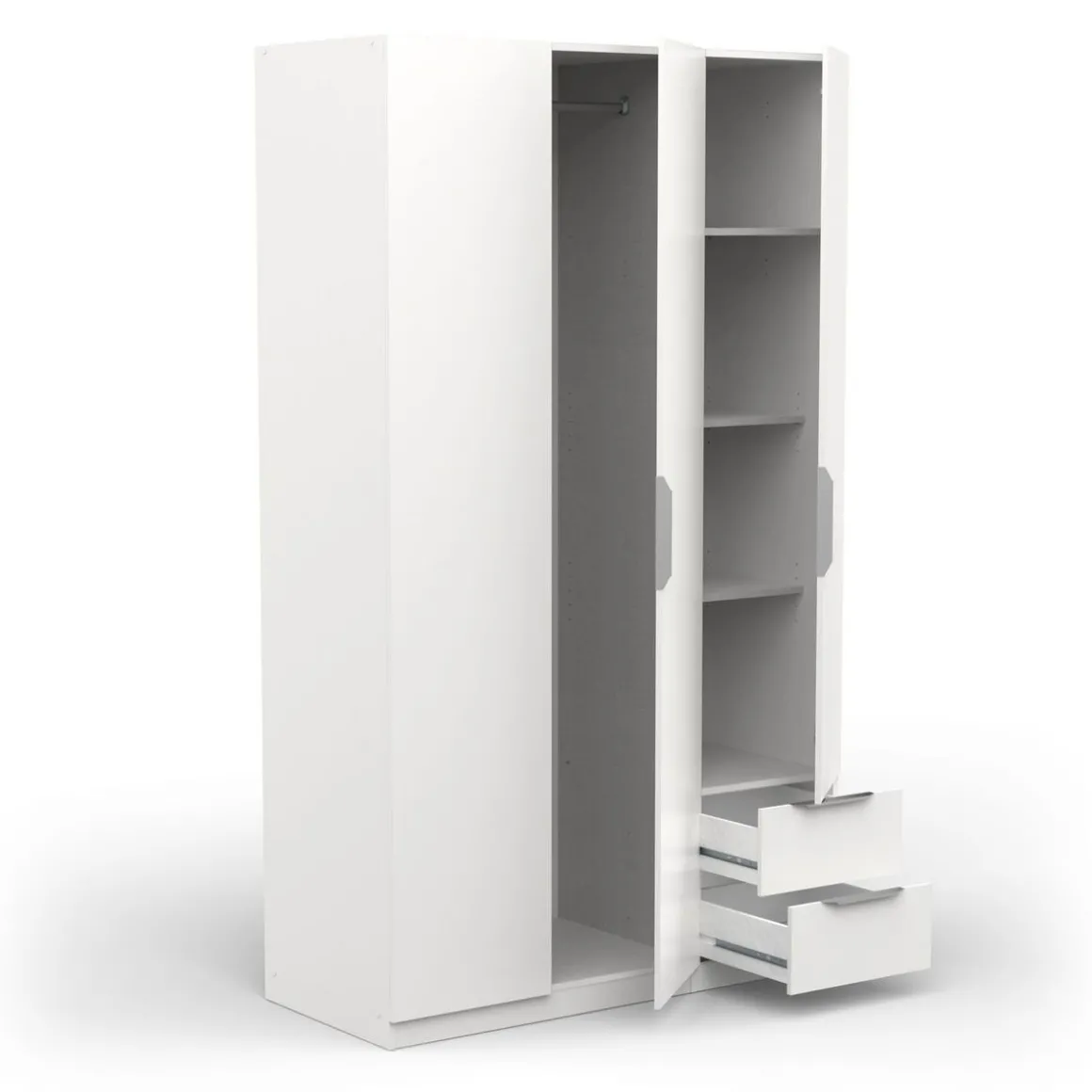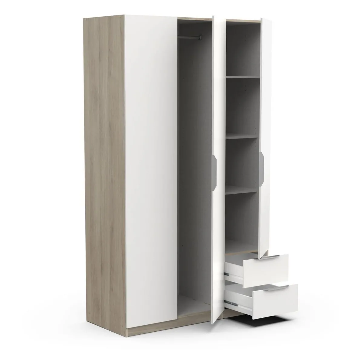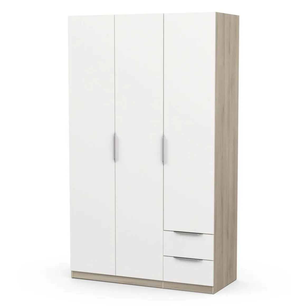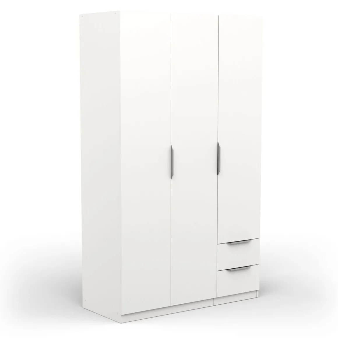 Armoire 3 portes + 2 tiroirs montés sur coulisses à billes, en panneaux de particules 12 et 15mm. Décor papier blanc mat. 1 barre de penderie, charge maximale : 19kg + 3 rayons dont 2 réglables sur 5 niveaux. Dimensions utiles des tiroirs : 35,2 x 38,7 x 10,6 cm ; charge maximale : 2kg