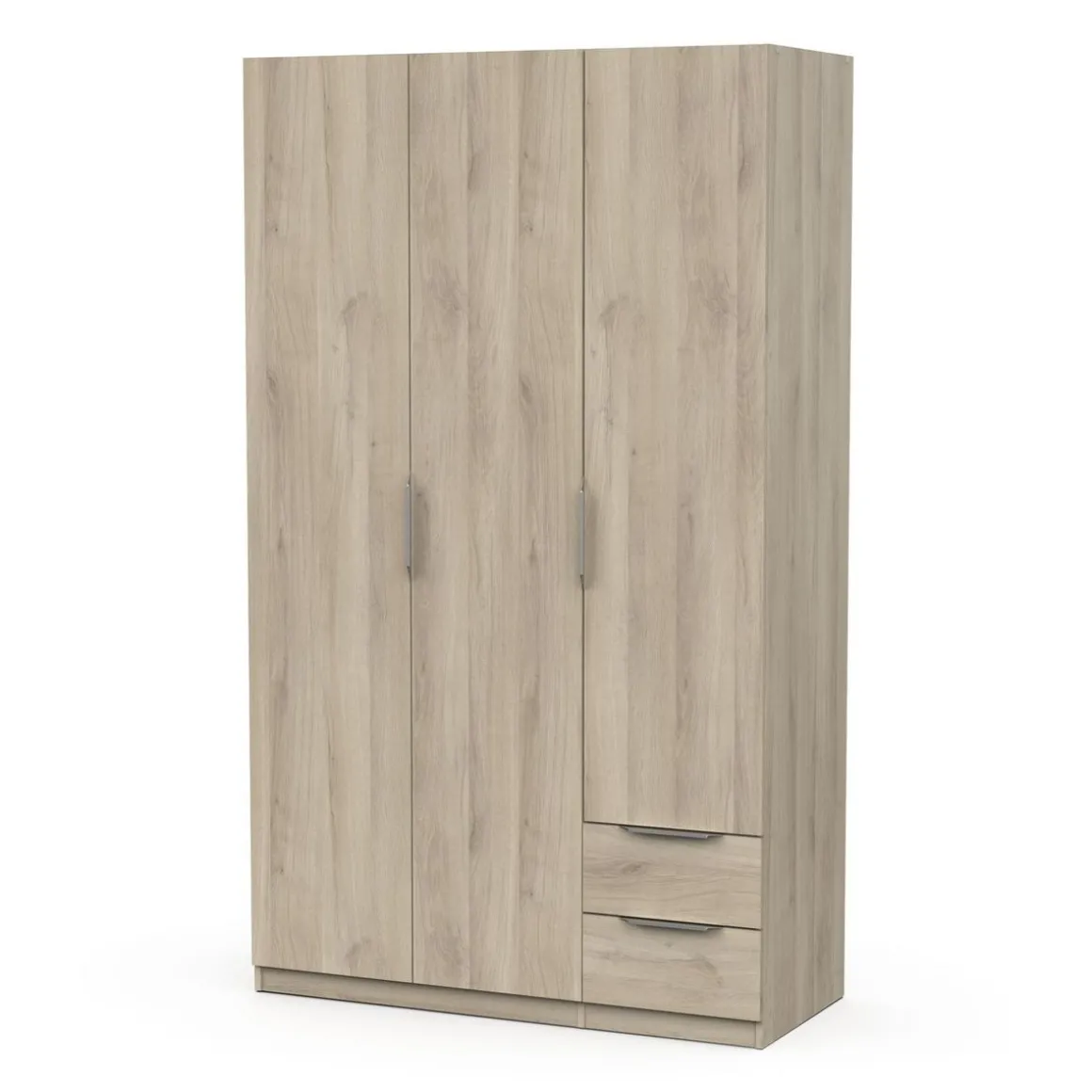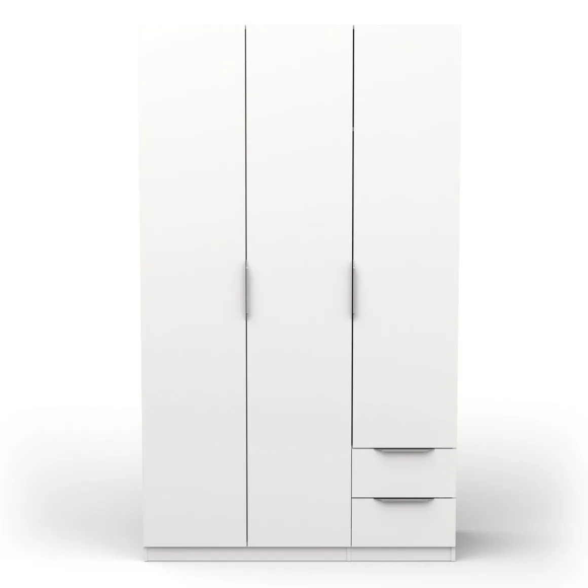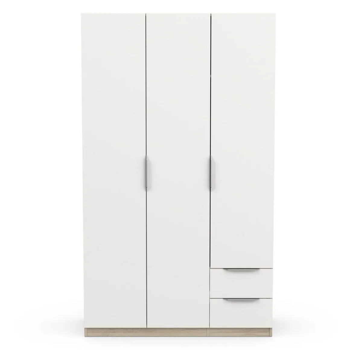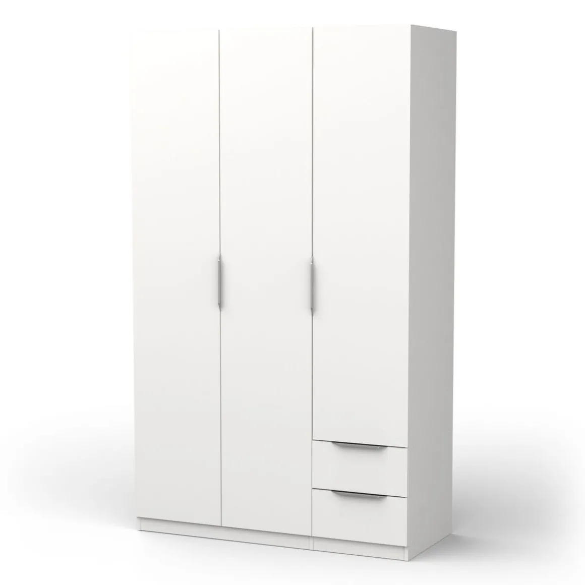Armoire 3 portes + 2 tiroirs montés sur coulisses à billes, en panneaux de particules 12 et 15mm. Décor papier blanc mat. 1 barre de penderie, charge maximale : 19kg + 3 rayons dont 2 réglables sur 5 niveaux. Dimensions utiles des tiroirs : 35,2 x 38,7 x 10,6 cm ; charge maximale : 2kg