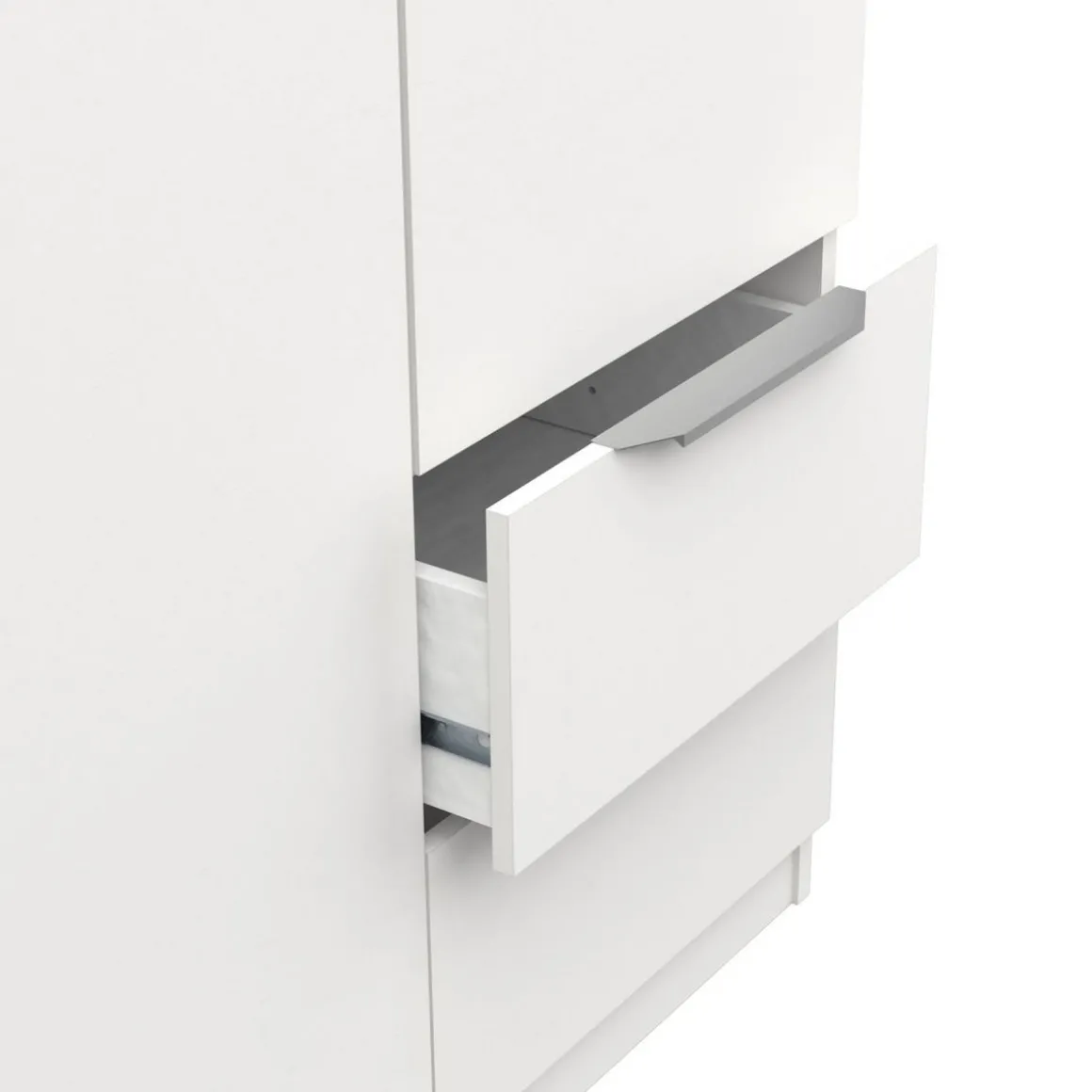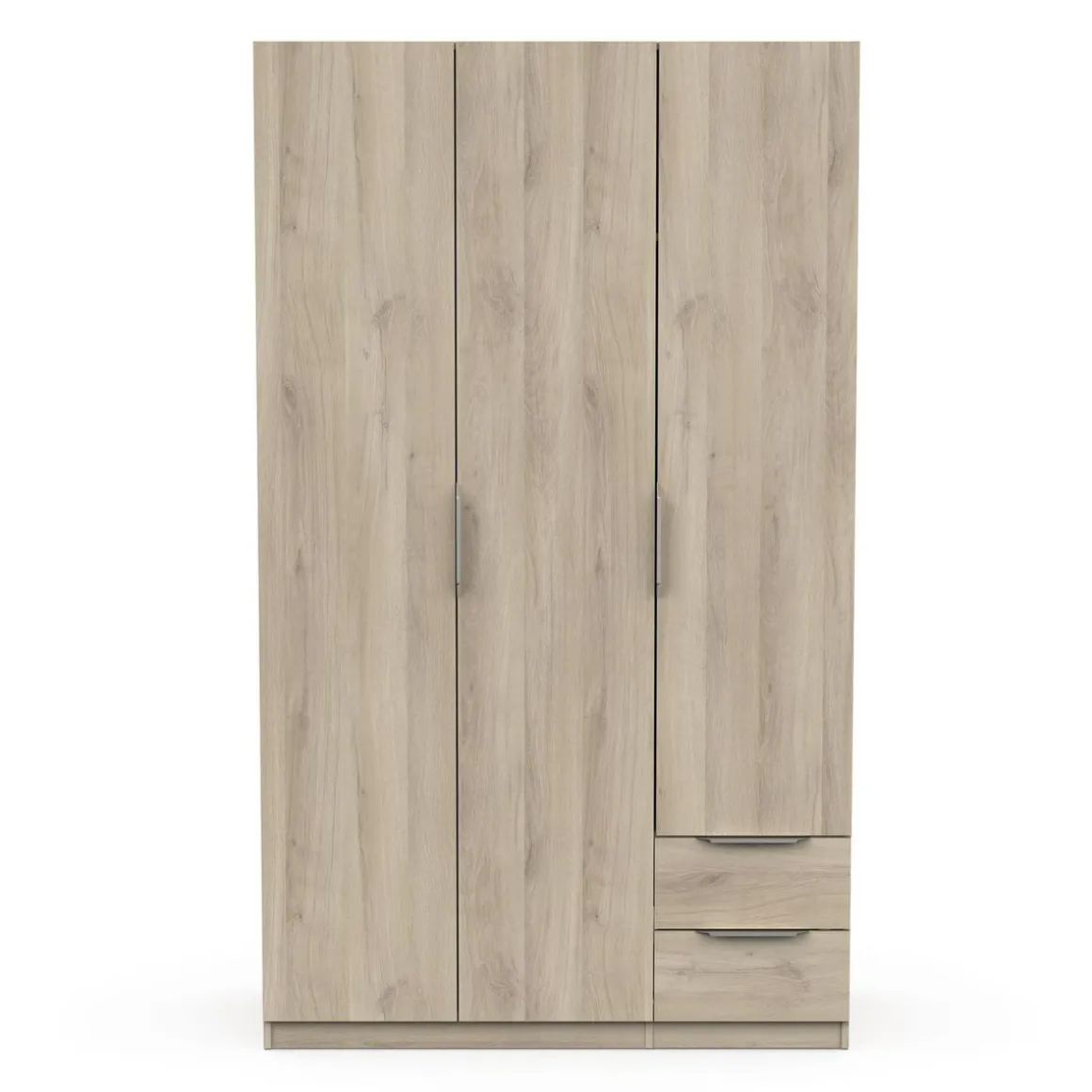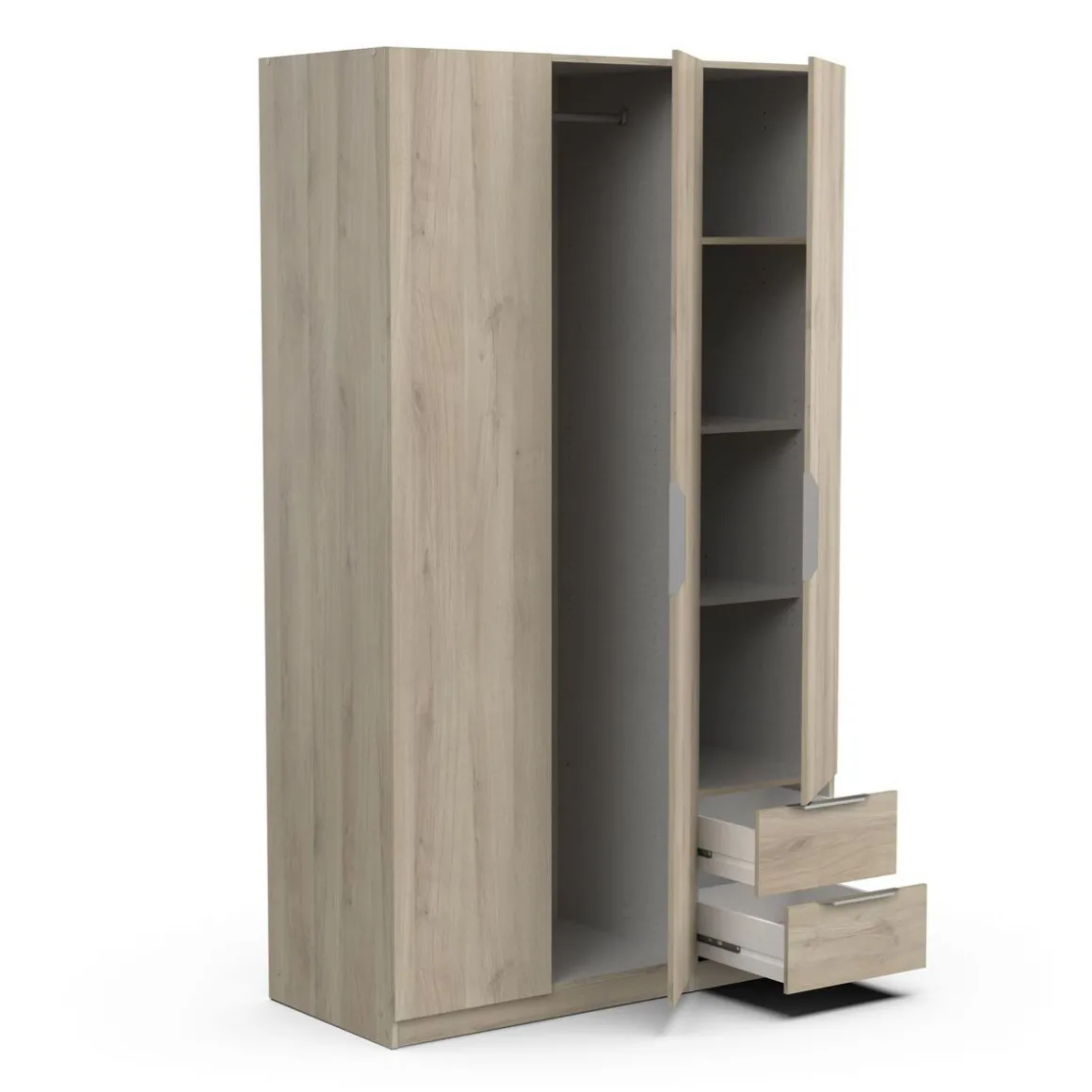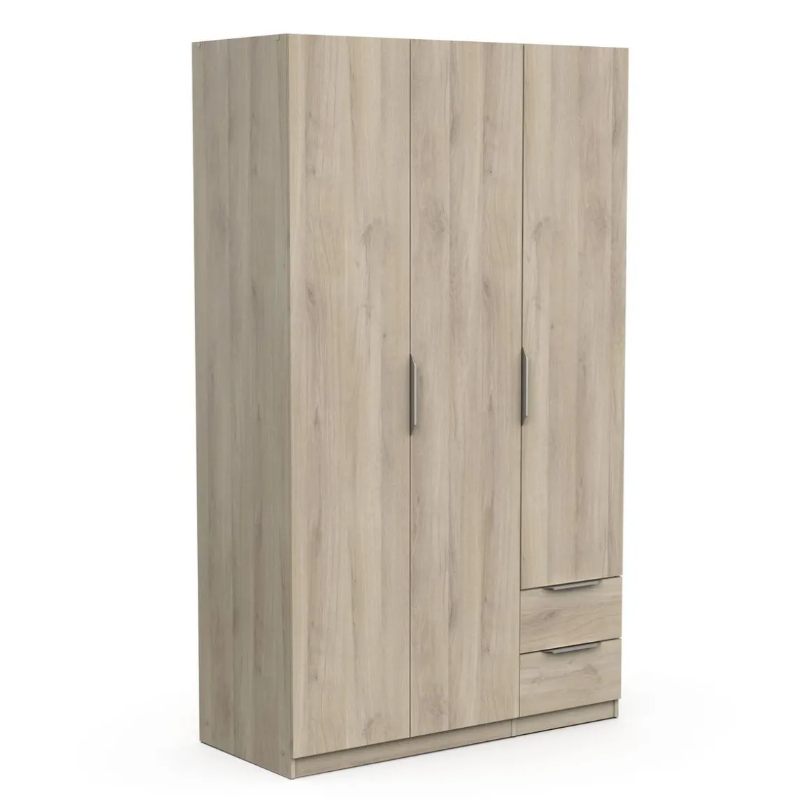 Armoire 3 portes + 2 tiroirs montés sur coulisses à billes, en panneaux de particules 12 et 15mm. Décor papier blanc mat. 1 barre de penderie, charge maximale : 19kg + 3 rayons dont 2 réglables sur 5 niveaux. Dimensions utiles des tiroirs : 35,2 x 38,7 x 10,6 cm ; charge maximale : 2kg