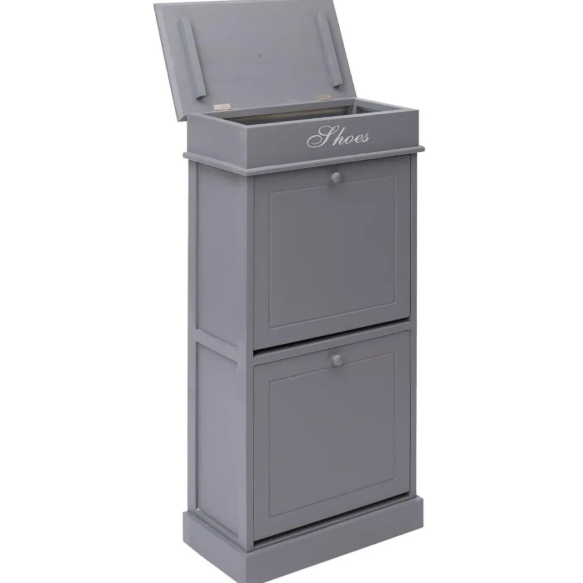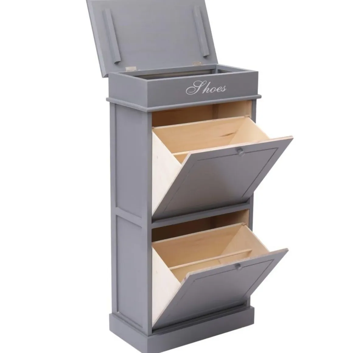 Les 2 grands compartiments inclinables ont des barres transversales pour garder les choses bien organisees, ce qui permet a l’armoire a chaussures de ranger les chaussures de maniere si agreable que vous pouvez facilement les voir et les enlever. Jusqu’a 10 paires de chaussures peuvent etre stockees sans poussiere. De plus, le dessus de l’armoire peut etre ouvert et vous pouvez utiliser le compartiment superieur pour ranger des accessoires de chaussure tels que des lacets, des coussinets de chaussure, ainsi que d’autres petits objets personnels.