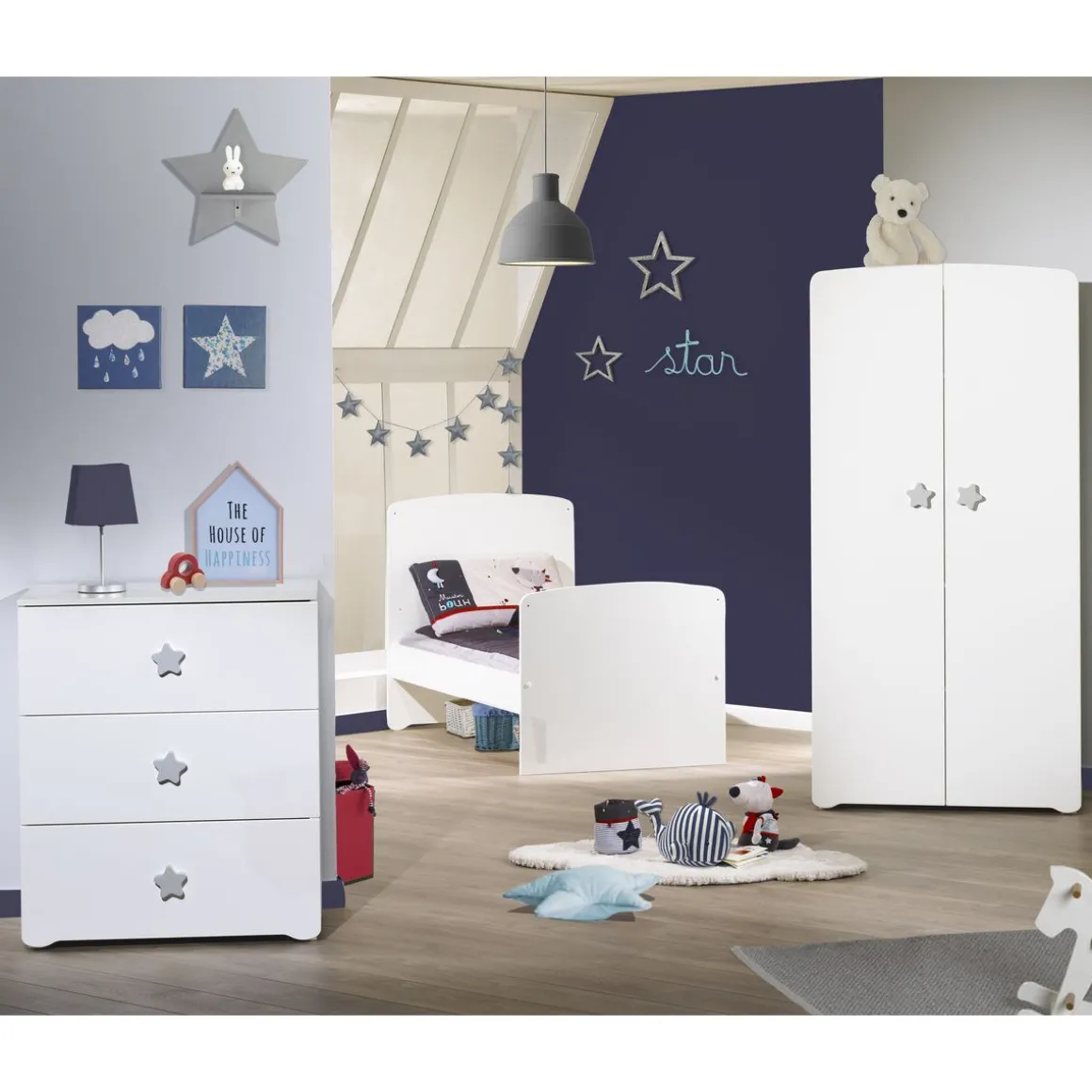 Besoin de rangement pour la chambre de votre bébé ? Laissez-vous tenter par l’armoire 2 portes STAR. Elle dipose avant tout d’un bon volume avec ses belles dimensions : 175 cm de hauteur, 56 cm de profondeur et 85cm de largeur. A l’intérieur vous attendent trois tablettes amovibles + une barre de penderie afin de ranger tout les habits de bébé et d’aménager l’intérieur comme bon vous semble. De fabrication française et garantie sans solvants, elle est conçu avec du bois PEFC provenant de forêts gérées de façon durable. Cette armoire STAR fait partie d’une collection du même nom qui comprend le lit bébé combiné évolutif, le lit simple et la commode à langer Si vous n’êtes toujours pas convaincu par ce produit, d’autres collections vous attendent sur Auchan.fr