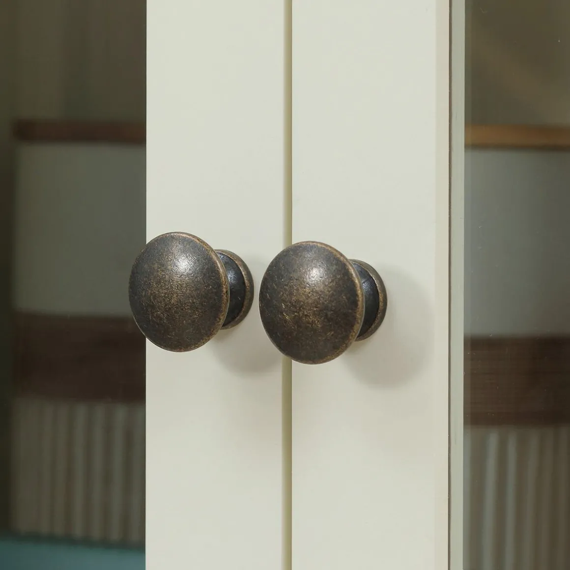 – Armoire de cuisine style altique chic coloris crème avec poignées boutons, coquilles métal laiton vieilli : idéale pour ajouter une touche d’élégance supplémentaire à votre intérieur