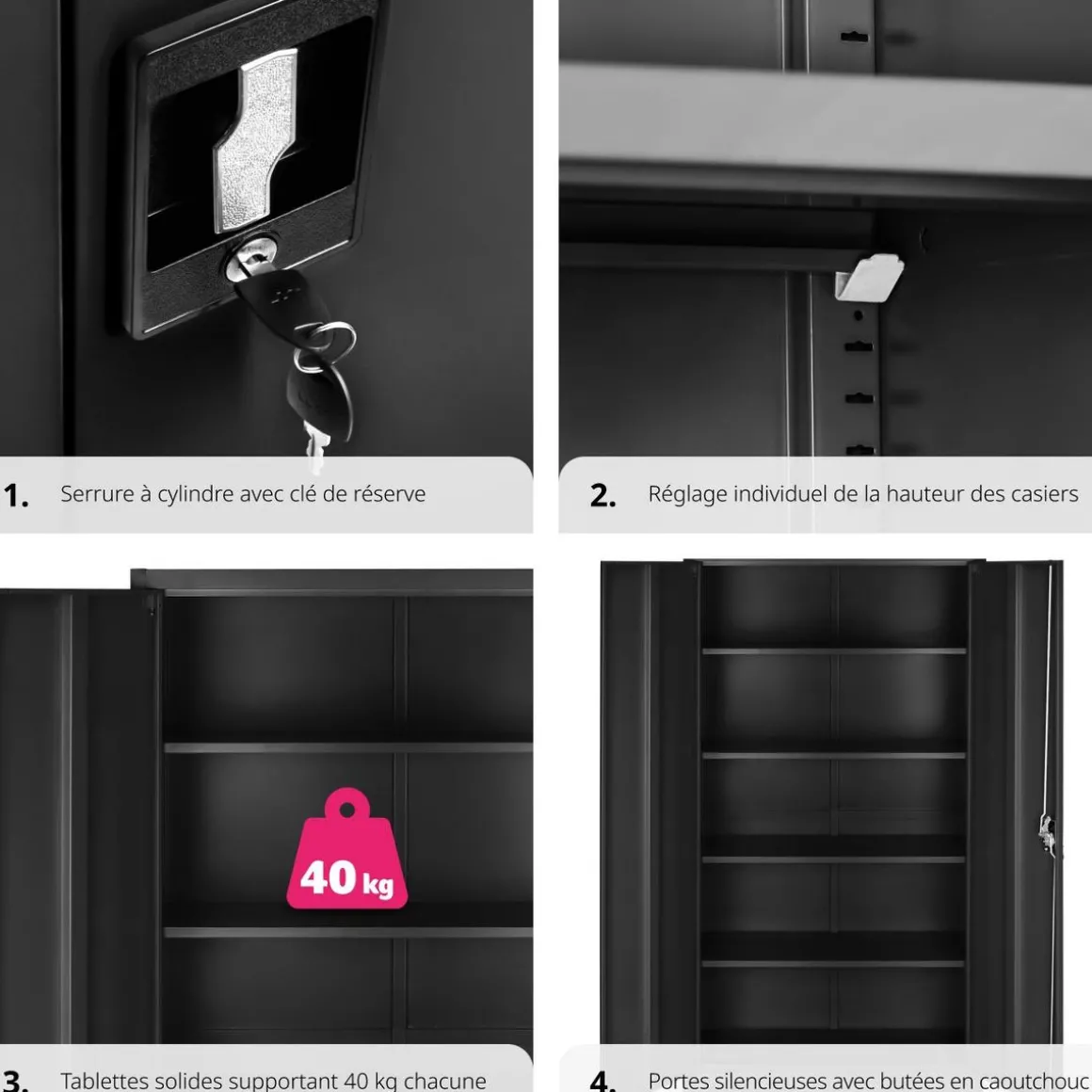 Avec ses 4 étagères réglables en hauteur, cette armoire métallique s’adapte parfaitement à vos besoins de rangement. Les étagères sont capables de supporter jusqu’à 40 kilogrammes chacune, offrant ainsi une solution robuste pour vos alteurs et autres fournitures de bureau. Que vous ayez besoin de stocker des valises ou des sacs, cette armoire est conçue pour accueillir des objets de grande taille grâce à sa hauteur d’environ 180 centimètres.
