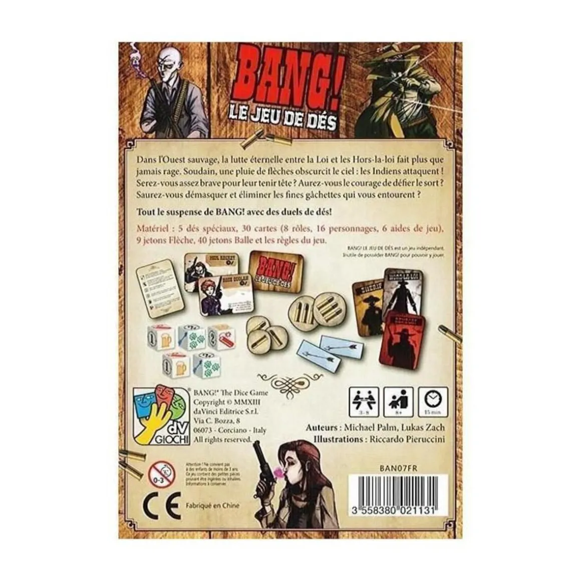 Le Shérif, les hors-la-loi et le renégat s’affrontent dans ce jeu de dés où les rôles sont secrets ! Un jeu complet inspiré du célebre jeu de cartes Bang!. Dans Bang! le jeu de dés, la lutte est acharnée entre le shérif, les hors-la-loi et le renégat. Chacun veut éliminer le clan adverse et les balles fusent de partout ! Méfiez-vous des Indiens et de la dynamite, et ne vous trompez pas d’ennemi,car les rôles sont se