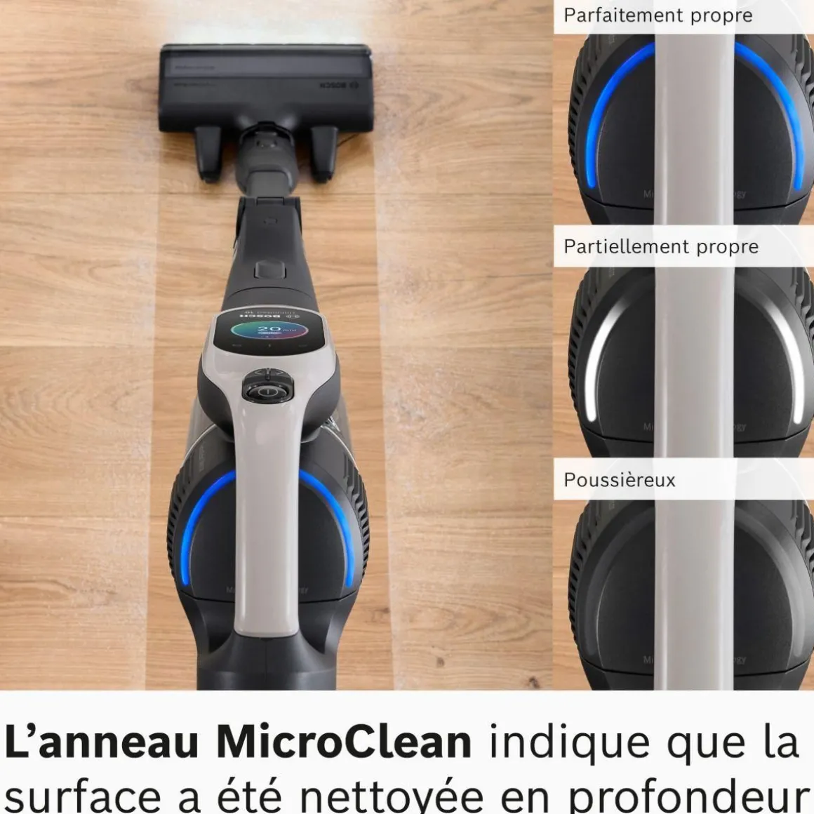 | Brosse motorisée avec éclairage LED | Elle s’adapte à tous les types de sols. Son éclairage LED permet de mieux voir la poussière et plus loin pour un nettoyage plus efficace | |