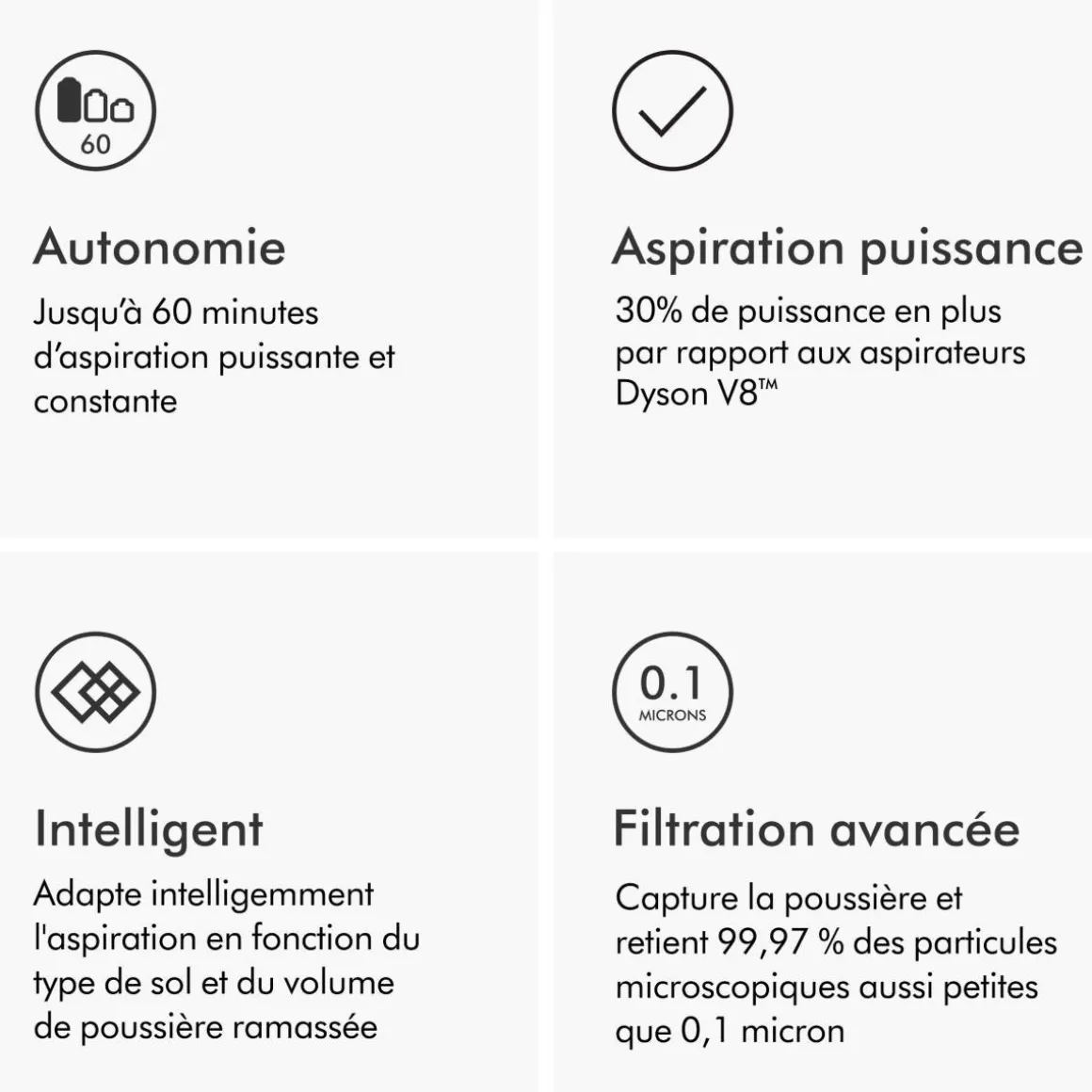 | Détail sur la puissance d’aspiration: | Elle peut varier en fonction du type de sols (parquet, carrelage, tapis, moquette) que vous aspirez et du mode utilisé (standard, éco, boost) | |