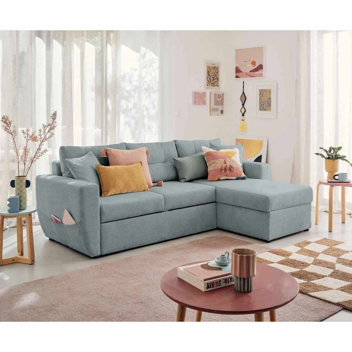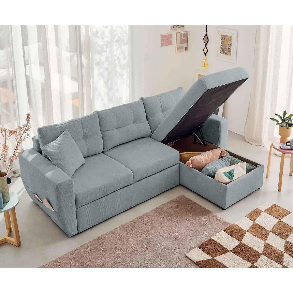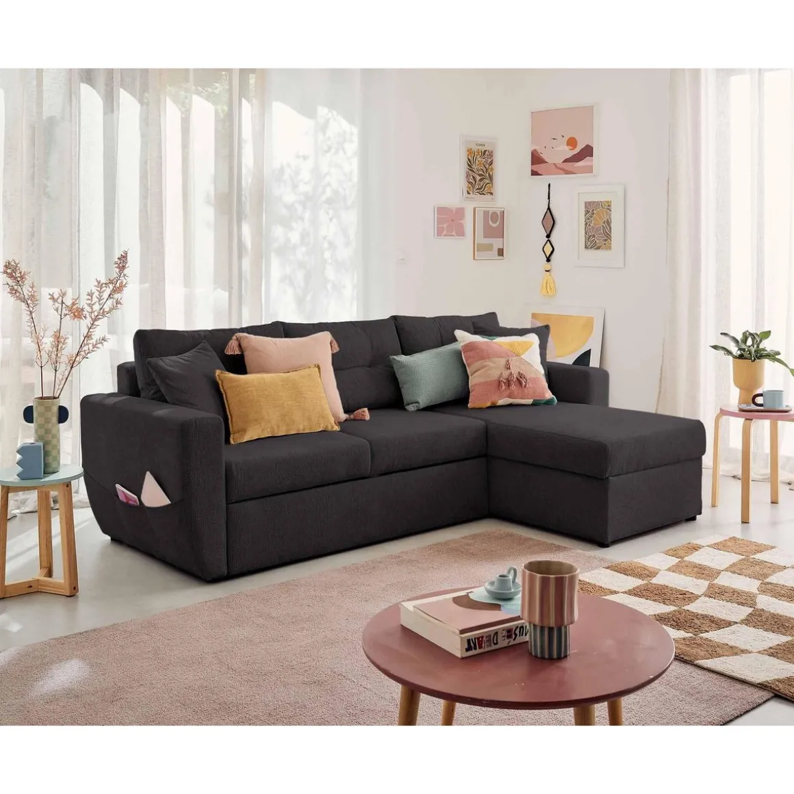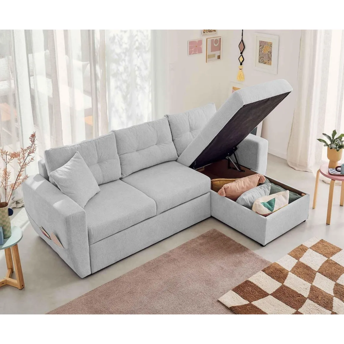 Le canapé d’angle Astoria possède une poche sur le côté de l’accoudoir afin d’y ranger télécommandes et magazines. Une fonction convertible est aussi disponible en dépliant le tiroir se trouvant sous l’assise pour accueillir occasionnellement vos proches ou encore passer un moment détente devant une série. Vous trouverez aussi un coffre de rangement sous la méridienne, pratique pour y glisser plaids, coussins. A droite ou à gauche, choisissez la position de l’angle qui vous convient grâce à sa fonction réversible.