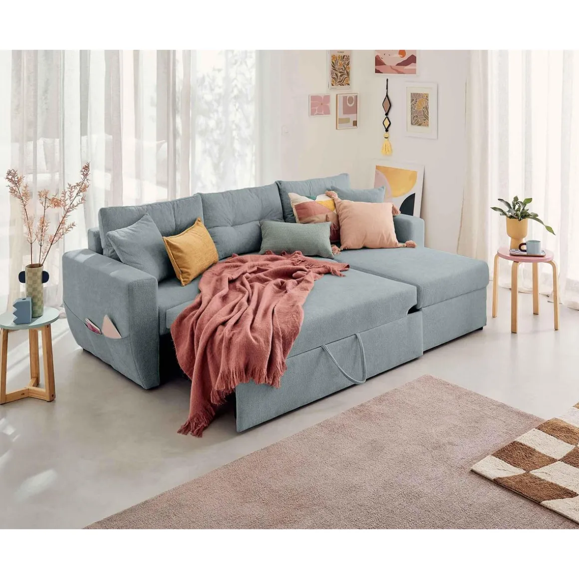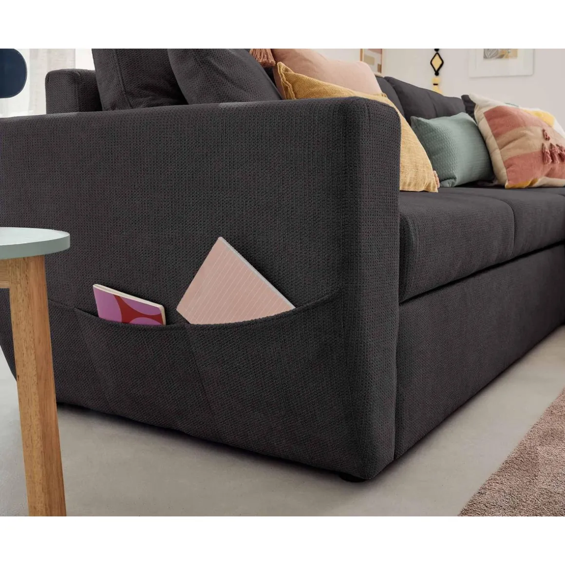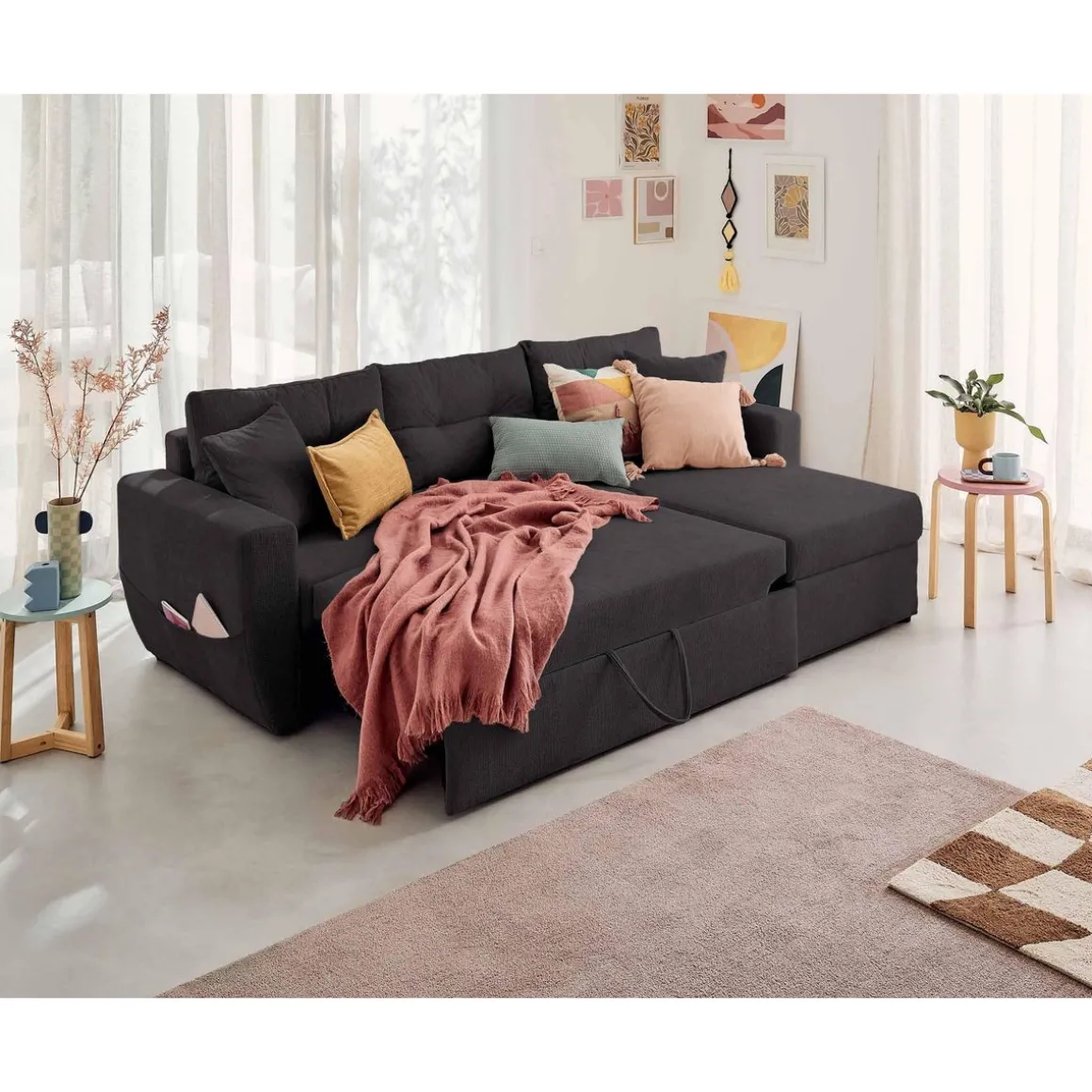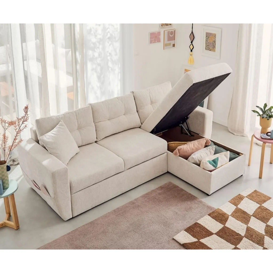 Le canapé d’angle Astoria possède une poche sur le côté de l’accoudoir afin d’y ranger télécommandes et magazines. Une fonction convertible est aussi disponible en dépliant le tiroir se trouvant sous l’assise pour accueillir occasionnellement vos proches ou encore passer un moment détente devant une série. Vous trouverez aussi un coffre de rangement sous la méridienne, pratique pour y glisser plaids, coussins. A droite ou à gauche, choisissez la position de l’angle qui vous convient grâce à sa fonction réversible.