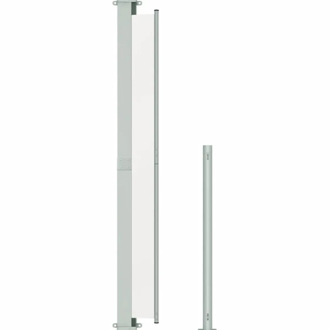 L’ecran est en polyester resistant aux UV, a l’eau et a la dechirure. La cassette est installee sur une base en acier robuste en position verticale, et l’auvent retractable peut etre tire tout droit. L’auvent dispose d’une fonction de retour automatique. La livraison comprend egalement des accessoires de montage.