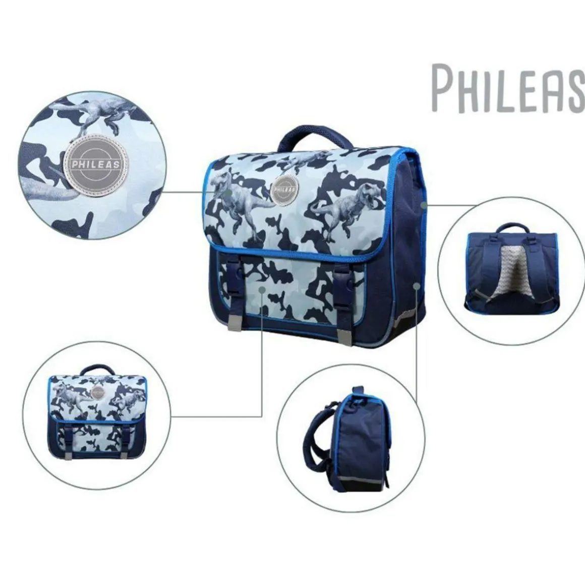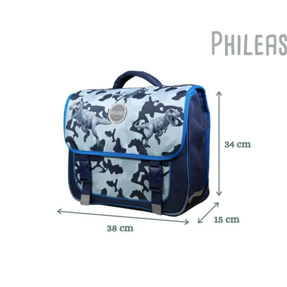 Le cartable Phileas 38cm est très innovant grâce à son système Smart Comfort qui le rend si unique. Son design ergonomique est inspiré des sacs de randonnée pour en faire le PLUS CONFORTABLE DES CARTABLES ! Ce design dinosaures et camouflage est tendance et intemporel. Ce grand cartable avec ses 2 compartiments et sa poche avant permettra à votre enfant d’y ranger sans problème toutes ses fournitures scolaires. Le tout protégé par un rabat fermé avec deux clips. Ses dimensions de 38cm de long, 16cm de large et 34cm de haut sont adaptées pour les altes de primaire. Coloris bleu. 100% polyester. Le dos moulé en mousse EVA permet au cartable d’épouser parfaitement le dos de l’enfant en allégeant la pression sur la colonne vertébrale. La mousse haute densité en demi-lune permet de protéger le bas du dos. Les bretelles ergonomiques enveloppent la partie avant des épaules avec une mousse ultra confort. Des sangles de rappel de charge permettent le réglage en hauteur, le tout pour une meilleure répartition du poids sur les épaules et un portage au plus près du dos garantissant une très bonne stabilité. Pour garantir la sécurité de votre enfant, ce cartable est équipé de bandes réfléchissantes. Soyez certain que ce modèle robuste garanti 10 mois ne vous décevra pas.
