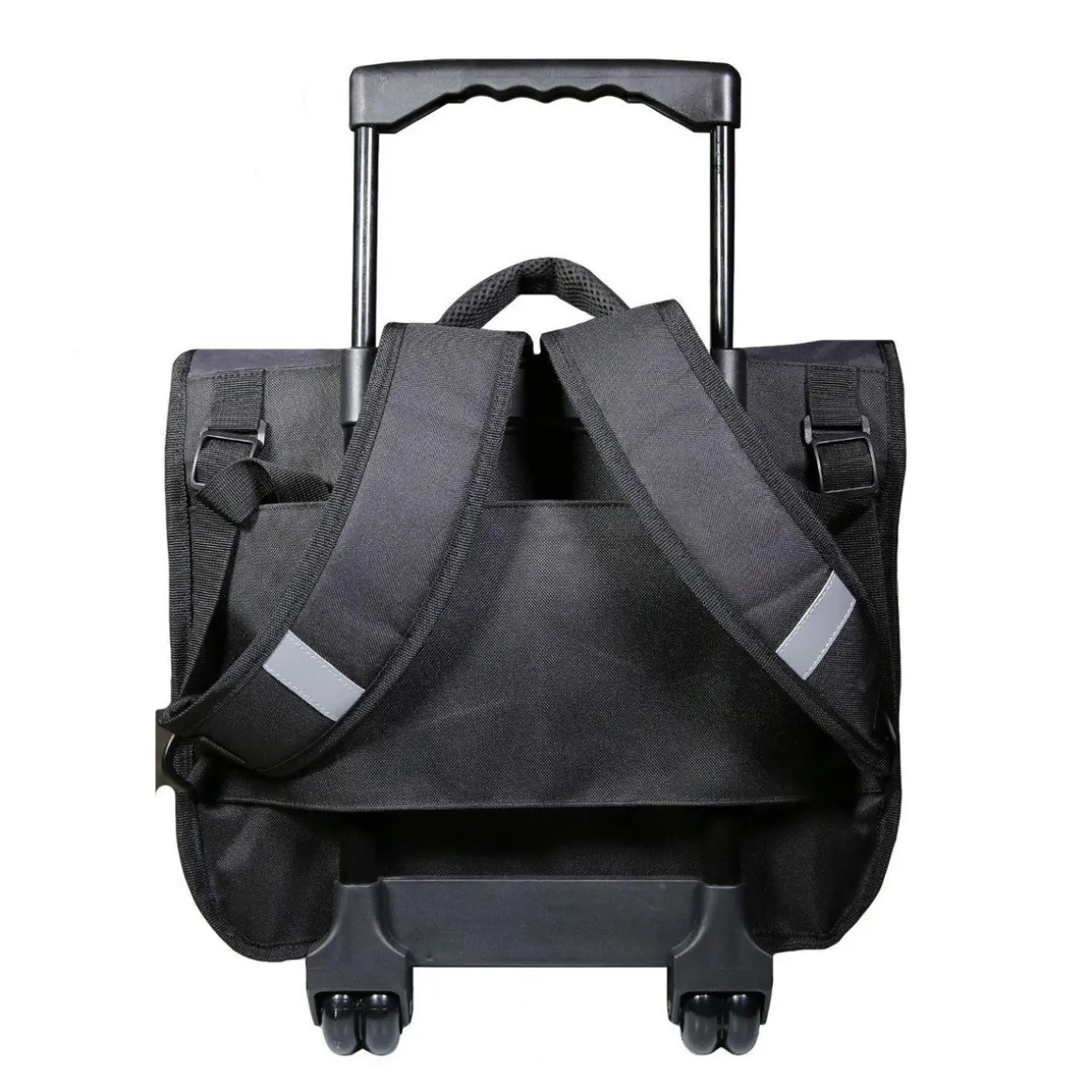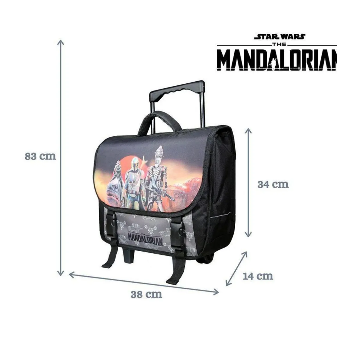 Le cartable à roulettes The Mandalorian 38cm sera parfait pour que votre enfant passe une bonne rentrée des altes et encore mieux, une bonne année scolaire ! Partez à l’aventure avec Le Mandalorian alias Mando ! Ce grand cartable avec ses 2 compartiments et sa poche avant permettra à votre enfant d’y ranger sans problème toutes ses fournitures scolaires. Le tout protégé par un rabat fermé avec deux clips. Ses dimensions de 38cm de long, 14cm de large et 34cm de haut sont adaptées pour les altes de primaire. Coloris noir. 100% polyester. Des bandes réfléchissantes assurent la visibilité de votre enfant sur le chemin de l’école. Nous avons équipé ce cartable d’une poignée télescopique et de roulettes solides. D’un dos et de bretelles matelassés ainsi que d’un fond et de coins renforcés. Un compartiment est prévu pour le rangement des bretelles et les sangles sont adaptées pour que l’enfant ne roule pas sur les bretelles . Soyez certain que ce modèle robuste garanti 10 mois ne vous décevra pas.