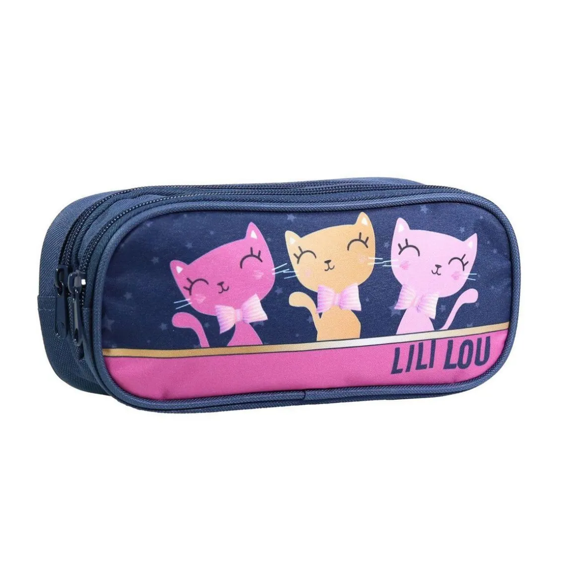 Le poids du cartable ne sera pas alourdi avec ce produit très léger. Cette trousse bleu marine et ses trois petits chats Lili Lou attendridont vos enfants avec leur adorable regard rieur.