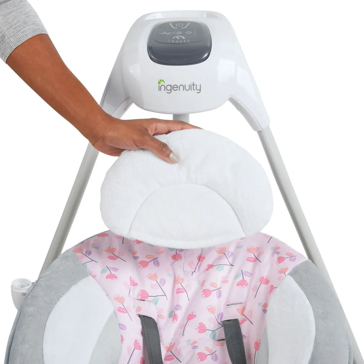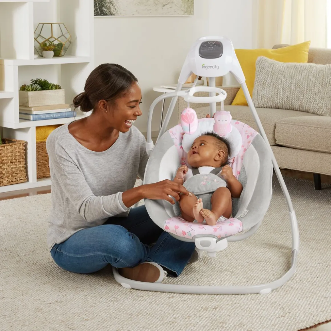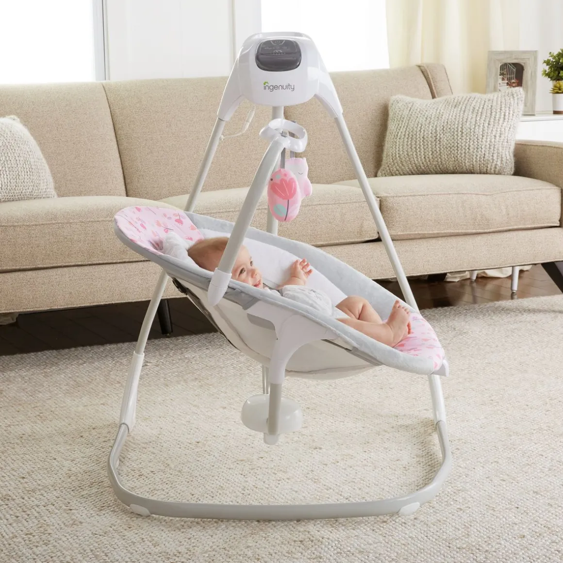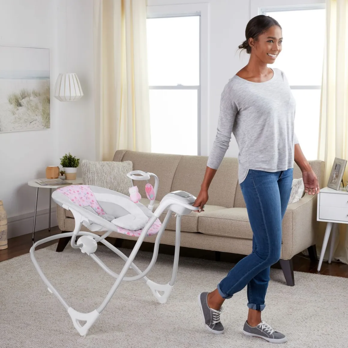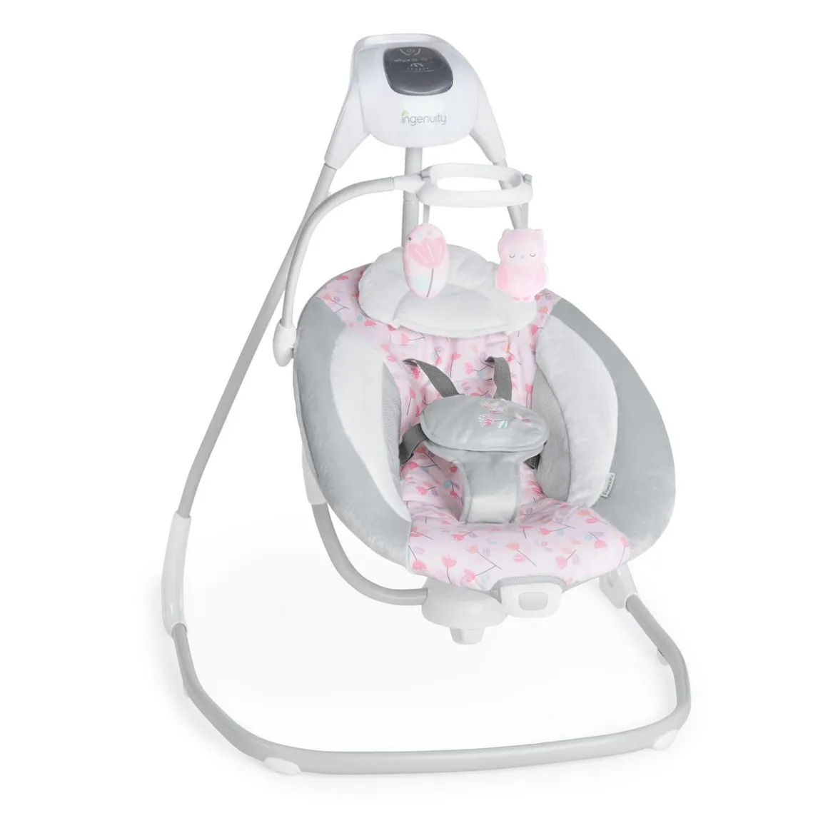 Quand ça va trop vite, vous auriez bien besoin d’un petit peu d’aide. Vous pouvez vous en sortir grâce à la balancelle tout confort Cassidy d’Ingenuity car bébé est confortablement installé et vous pouvez le surveiller d’un œil. Cette balancelle a été conçue pour bercer doucement les tous petits. Ajustez l’inclinaison du siège, choisissez l’une des trois directions de balancement ou alternez les 6 vitesses. Confort assuré grâce à des vibrations et balancements tous doux. Bébé adore voir ses jouets suspendus au-dessus de sa tête et s’amuse en toute tranquillité. Le siège pivote sur 180º et maman est rassurée car elle ne perd pas de vue son bout de chou. Structure super légère sur roues pour des déplacements faciles d’un espace à un autre. Livrée avec un adaptateur de courant. Chaque élément de la balancelle a été conçu pour un usage parents-bébé optimal. Pendant que bébé se balance gentiment, profitez-en pour mettre une lessive en marche ou avancer dans votre liste de tâches ménagères.