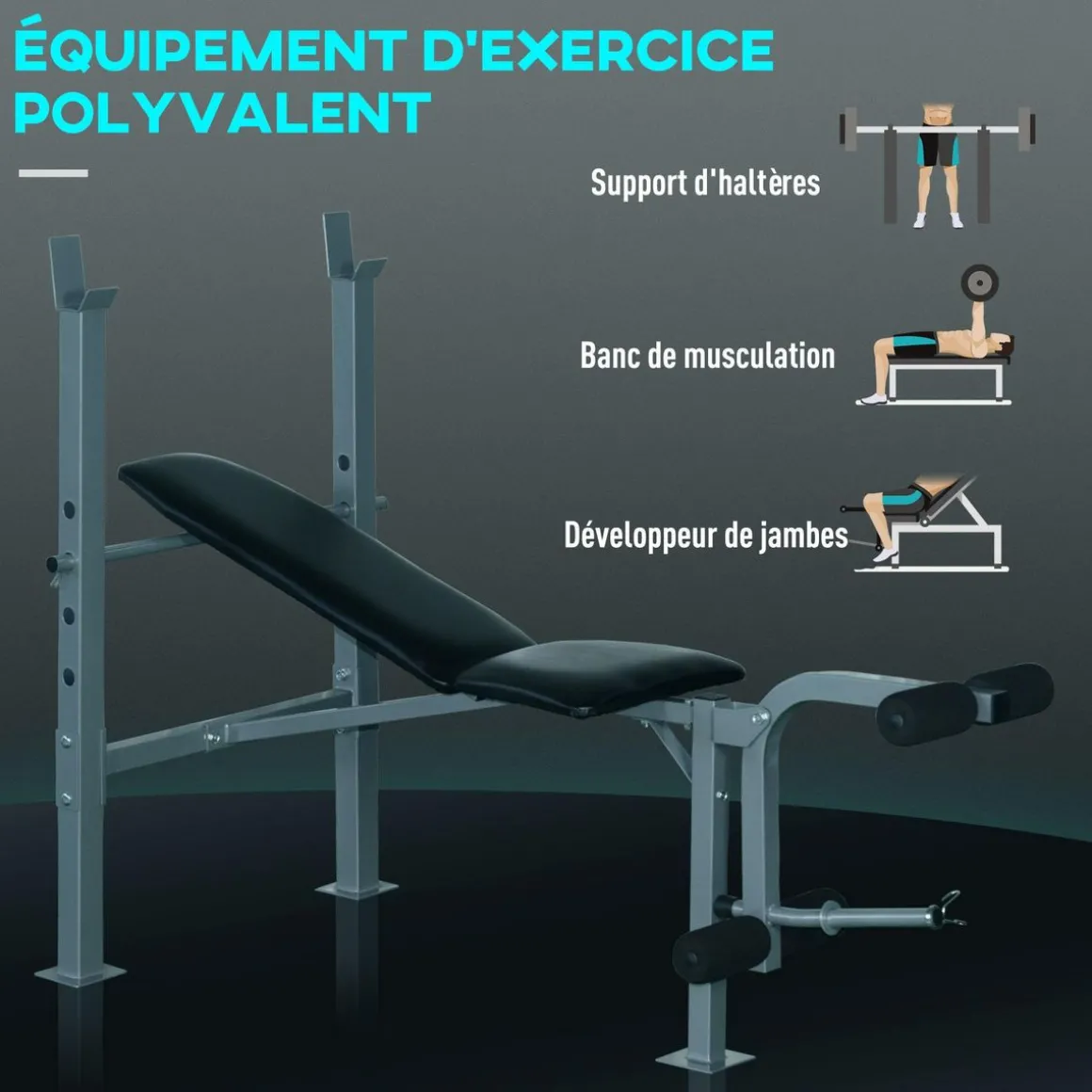 – Nombreux équipements : support barre, support haltères, curler jambes
