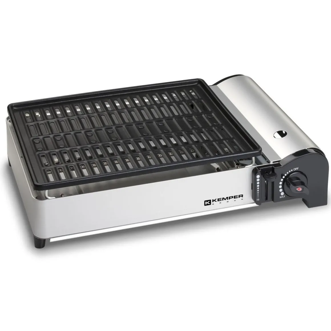 Ce barbecue portable à gaz KEMPER d’une puissance de 1900 W est léger et facilement transportable grâce à son sac de transport. Il permet de cuisiner et griller des aliments en s’installant dans n’importe quels lieux comme à la maison, en camping, en terrasse, en extérieur. Cet appareil fonctionne à l’aide d’une cartouche de gaz butane de type 227 gr. Il est équipé d’un brûleur à gaz en acier inoxydable, d’une valve de sécurité contre les risques de surpression, d’un bac collecteur de graisses, et d’un réglage de la température de cuisson. Ce barbecue dispose d’une plaque grille de cuisson avec un revêtement anti-adhésive. Le kit contient: 1 barbecue portable, 1 sac de transport, 4 cartouches de gaz camping.
