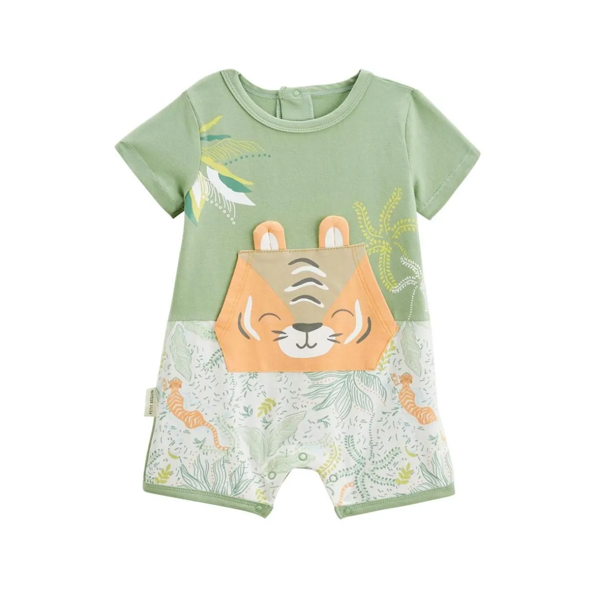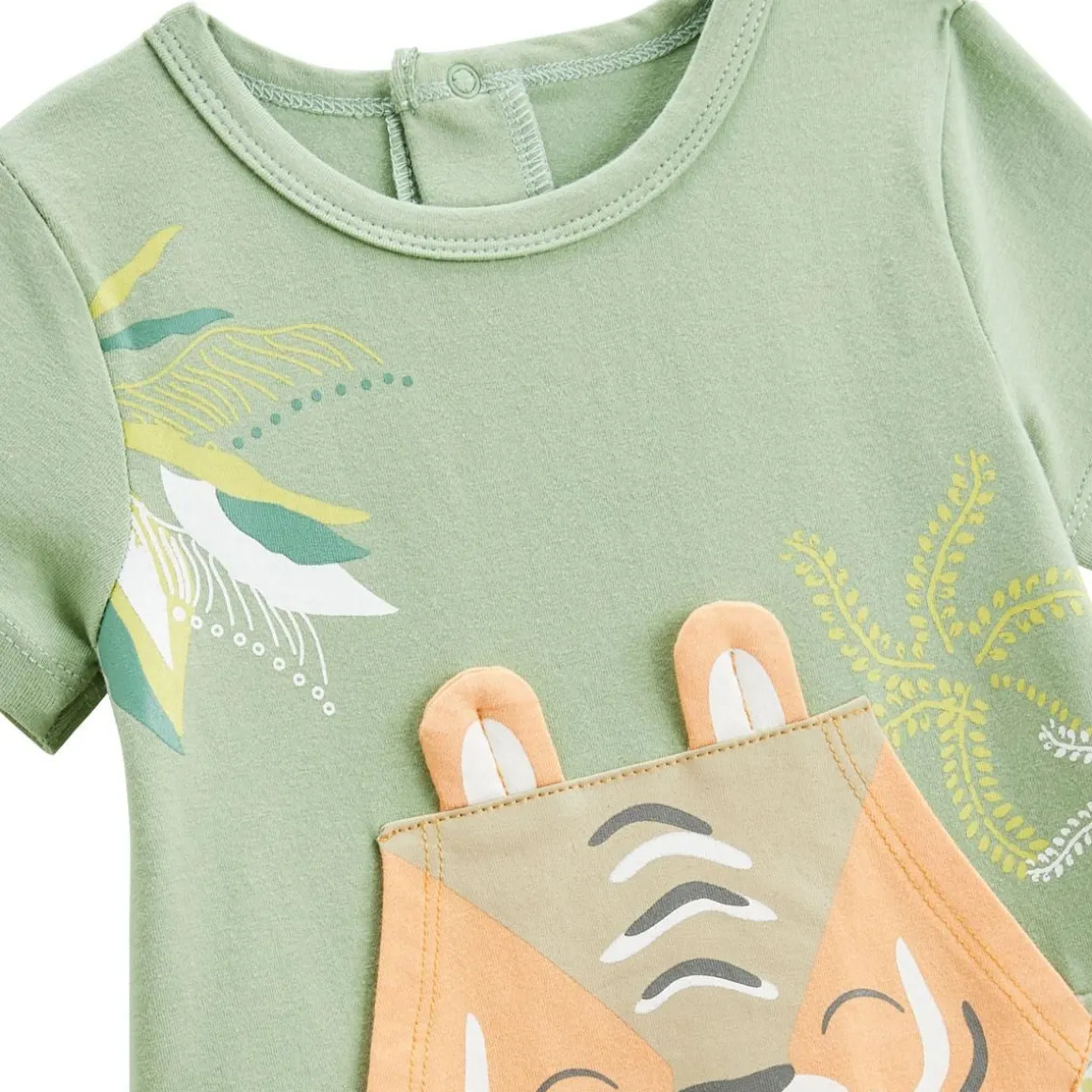 Toute douce dans ses tons écrus et verts, notre barboteuse nous fait craquer pour sa poche kangourou pratique et adorablement imprimée d’un petit tigre. Avec ses détails craquants et sa coupe confortable, elle accompagnera bébé partout, tout en étant à l’aise. Une ouverture pressionnée à l’entrejambe et dans le dos Produit labellisé STANDARD 100 by OEKO-TEX ® (BJ020 189402 TESTEX)