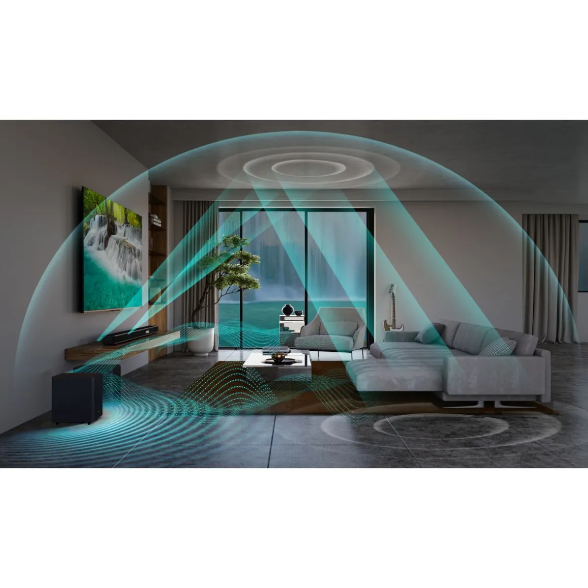 La barre de son Hisense AX3120G délivre une puissance de 360 W avec un système 3.1.2 canaux, intégrant Dolby Atmos et DTS