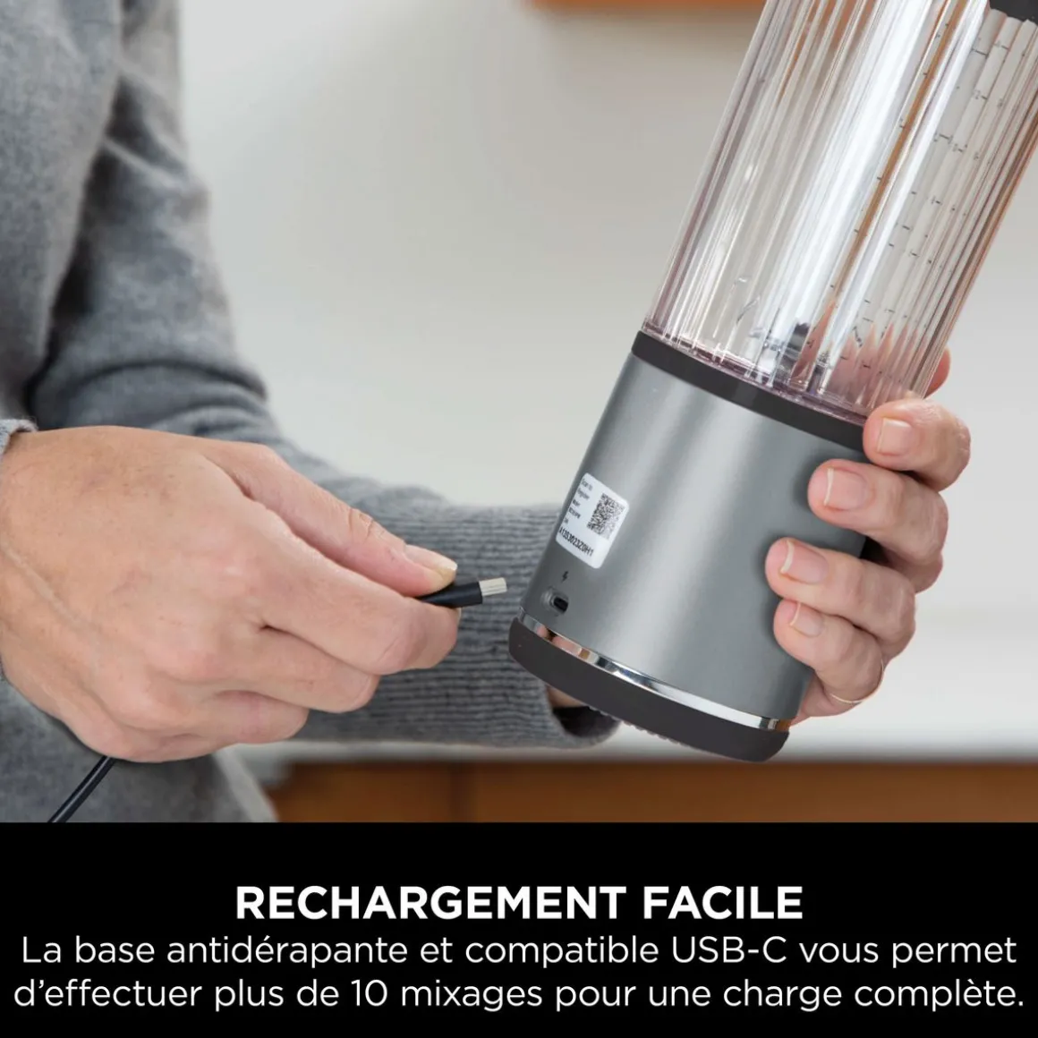 Inclus : Un bloc moteur rechargeable par USB-C, 1 gobelet de mixage 530 ml, 1 couvercle anti-fuite refermable avec bec verseur et poignée de transport intégré, 1 coque protège-lames, 1 couvercle de gobelet, 1 câble USB-C, 1 livret de recettes. Dimensions : H270mm x L90mm x l85mm.