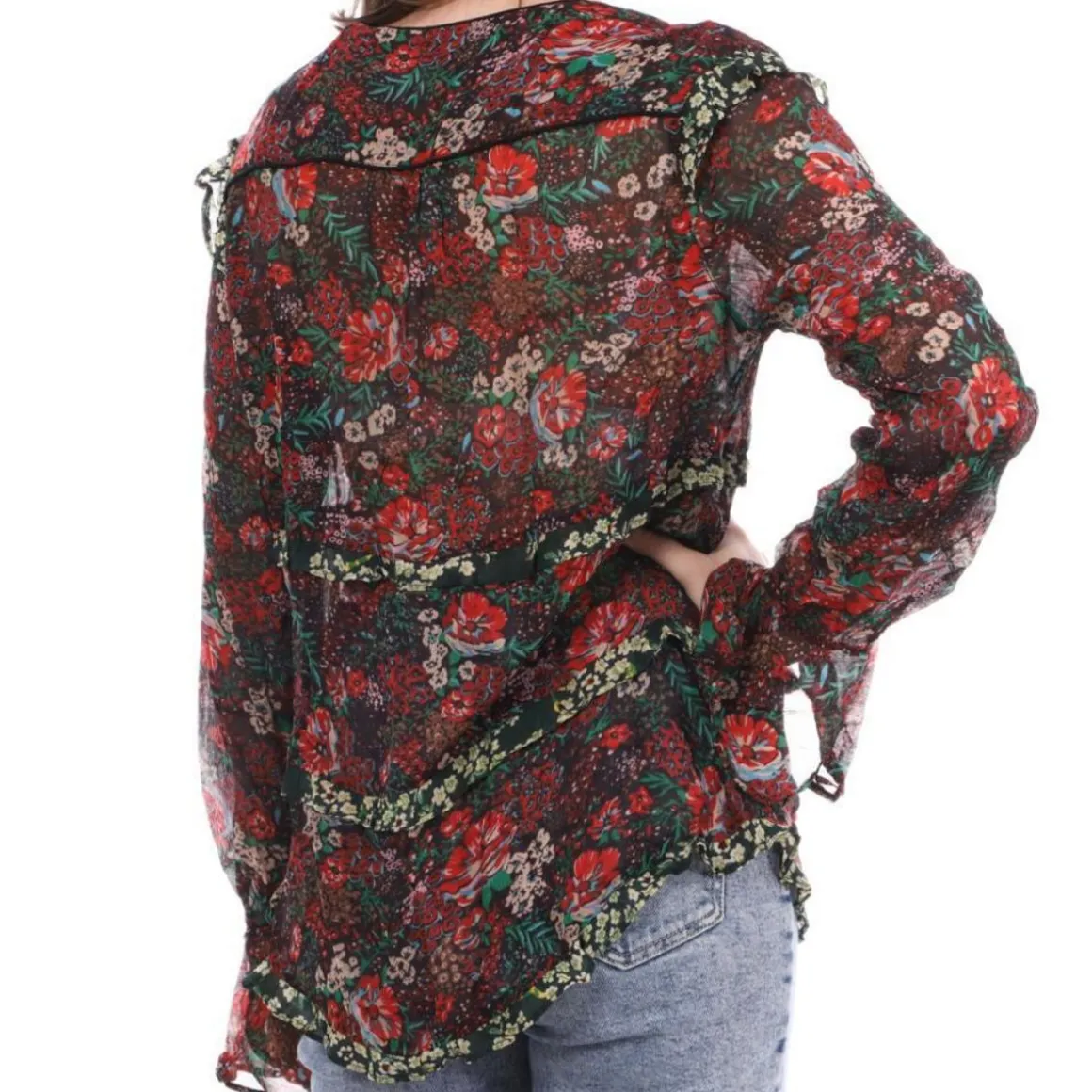 Blouse femme de la marque Scotch and Soda Manches longues à volants Col rond Imprimé : Fleurs + Léopard Tissu fluide Volants sur l’avant de la blouse Coloris : rouge / vert Composition : 100% viscose