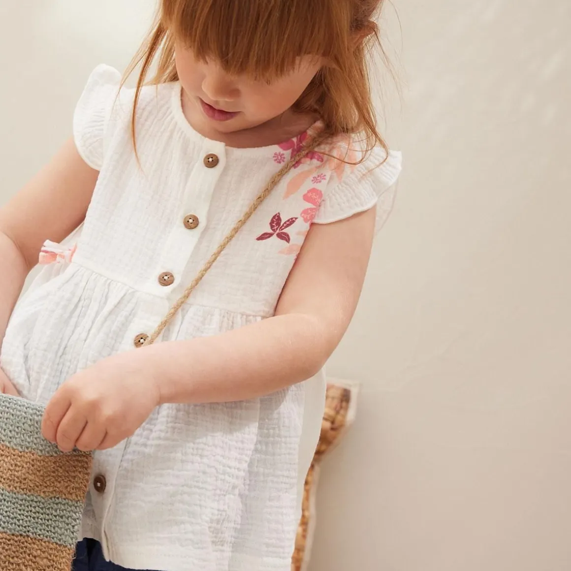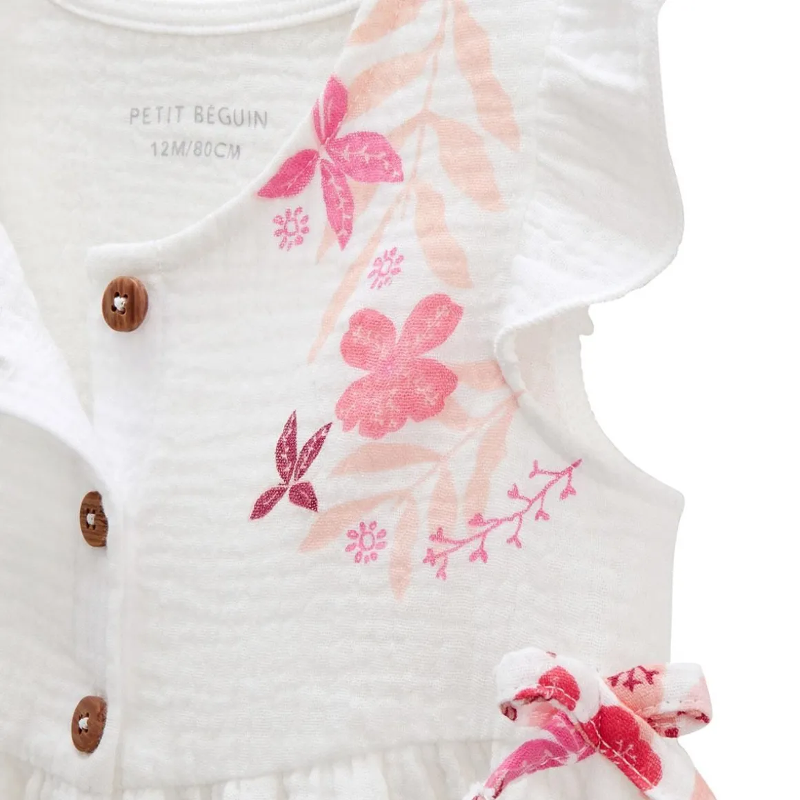 Des petits nœuds fleuris, des fronces et une ouverture complète sur le devant : cette blouse va parfaitement trouver sa place dans le dressing de bébé ! On craque pour la légère matière du coton gaufré et son ambiance florale, idéale pour les beaux jours. Produit labellisé STANDARD 100 by OEKO-TEX ® (BJ020 189402 TESTEX) Une ouverture complète sur l’avant On craque pour la matière gaze de coton Des petits noeuds et volants trop craquants