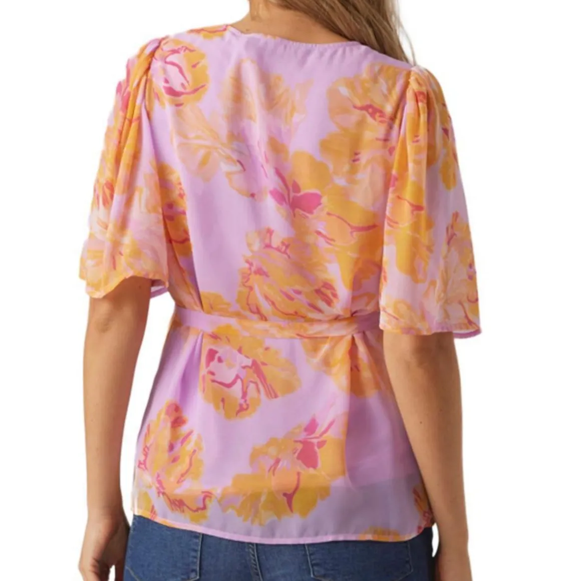 Craquez pour la blouse de maternité de la marque VERO MODA MATERNITY ! Coloris : Violet – Orange Col V Manches courtes Tissu imprimé Noué à la taille Composition : 100% Polyester