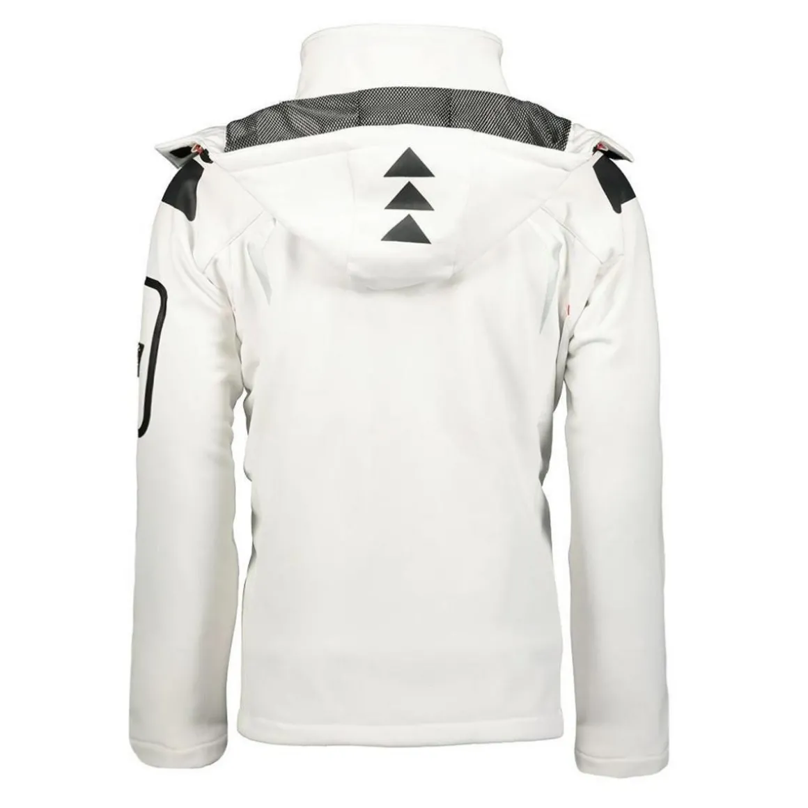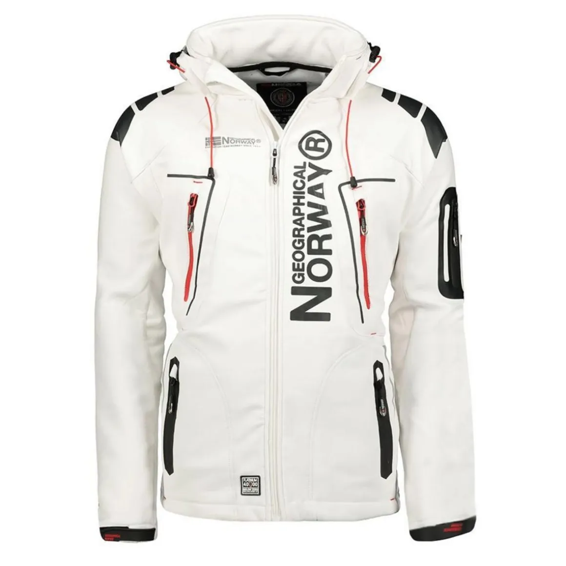Restez bien au chaud avec ce blouson de la marque Geographical Norway !Capuche amovibleRésistant au vent et à l’eauFermeture éclairCol montantVeste softshellCol montant avec zip frontal à fermeture hauteBande élastique avec stoppeur à l’ourlet pour régler la largeurComposition : 96 % polyester, 4 % élasthanneCouleur : Blanc