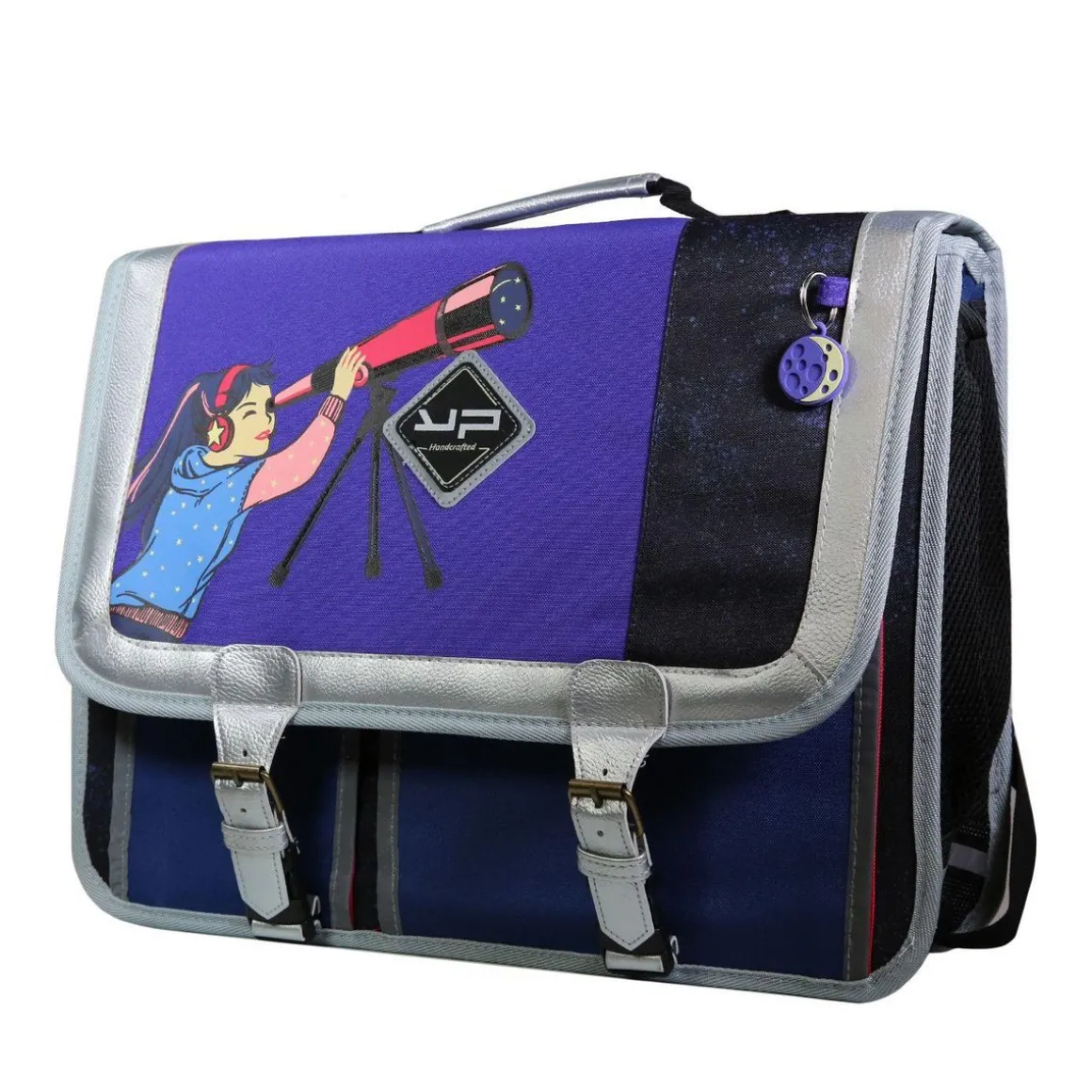 L’année scolaire promet d’être studieuse pour votre enfant. Ce cartable 41 cm Emma Étoile conviendra parfaitement aux altes de primaire.Dans un souci d’éco-responsabilité, les produits Bodypack sont conçus en tissu recyclé. Bien qu’il soit léger grâce à sa matière, ce cartable dispose d’un fond renforcé. Laissons à nos enfants une planète en bonne santé ! Ce cartable mesure 35 cm de haut, 41 cm de long et 14 cm de large, pour un poids de 930 grammes. Hyper ergonomique, il dispose de 2 grands compartiments avec une fermeture boucle, d’une poche séparation zippée, de 2 poches avant ainsi que d’une poche bouteille. La poche porte-règle permettra à vos enfant de ranger toutes ses petites fournitures scolaires.Pour un maximum de confort, le dos et les bretelles sont moussées. Également réglables, ces bretelles disposent de bandes réfléchissantes pour garantir une sécurité maximale sur le chemin de l’école. Retrouvez Emma observant les étoiles à l’aide de son camescope géant sur ce cartable bleu nuit garanti 2 ans. Phosphorescent, vous apercevrez quelques petites étoiles brillantes dans le noir