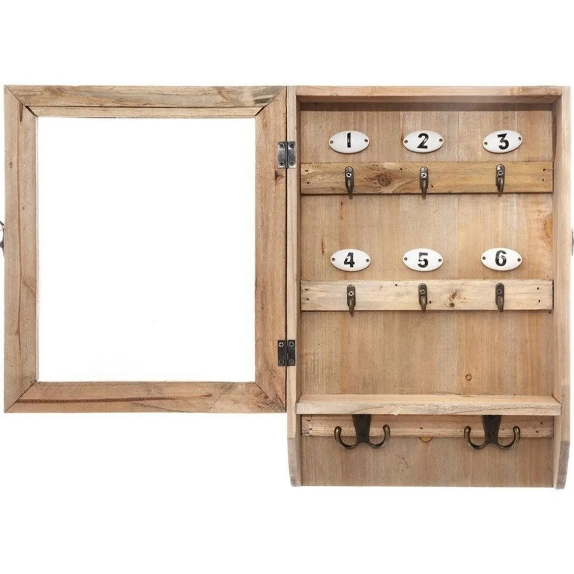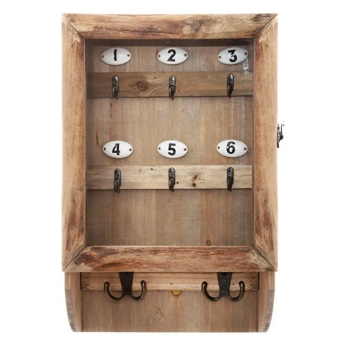 Boîte à clés rétro en boisCréez une décoration à la fois originale tout en étant très utile grâce à cette boîte à clés rétro en bois au look très vintage. Ambiance milieu du siècle dernier pour cette jolie boite à clés rétro avec ses 6 crochets pour ranger les clés et 2 crochets pour y suspendre des vêtements. Information sur la boîte à clés rétro en bois :Dimensions : L. 26 x l. 8,5 x H. 38 cmMatière : fer, verre, sapinPoids : 1,4 kg