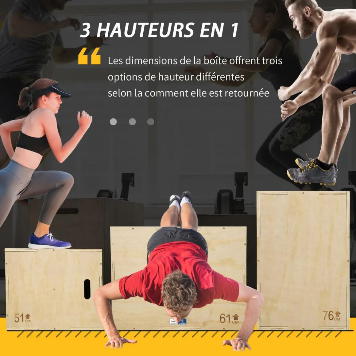– Boite de saut 3 hauteurs 51/61/76H cm suivant la position dans laquelle vous installez votre boite