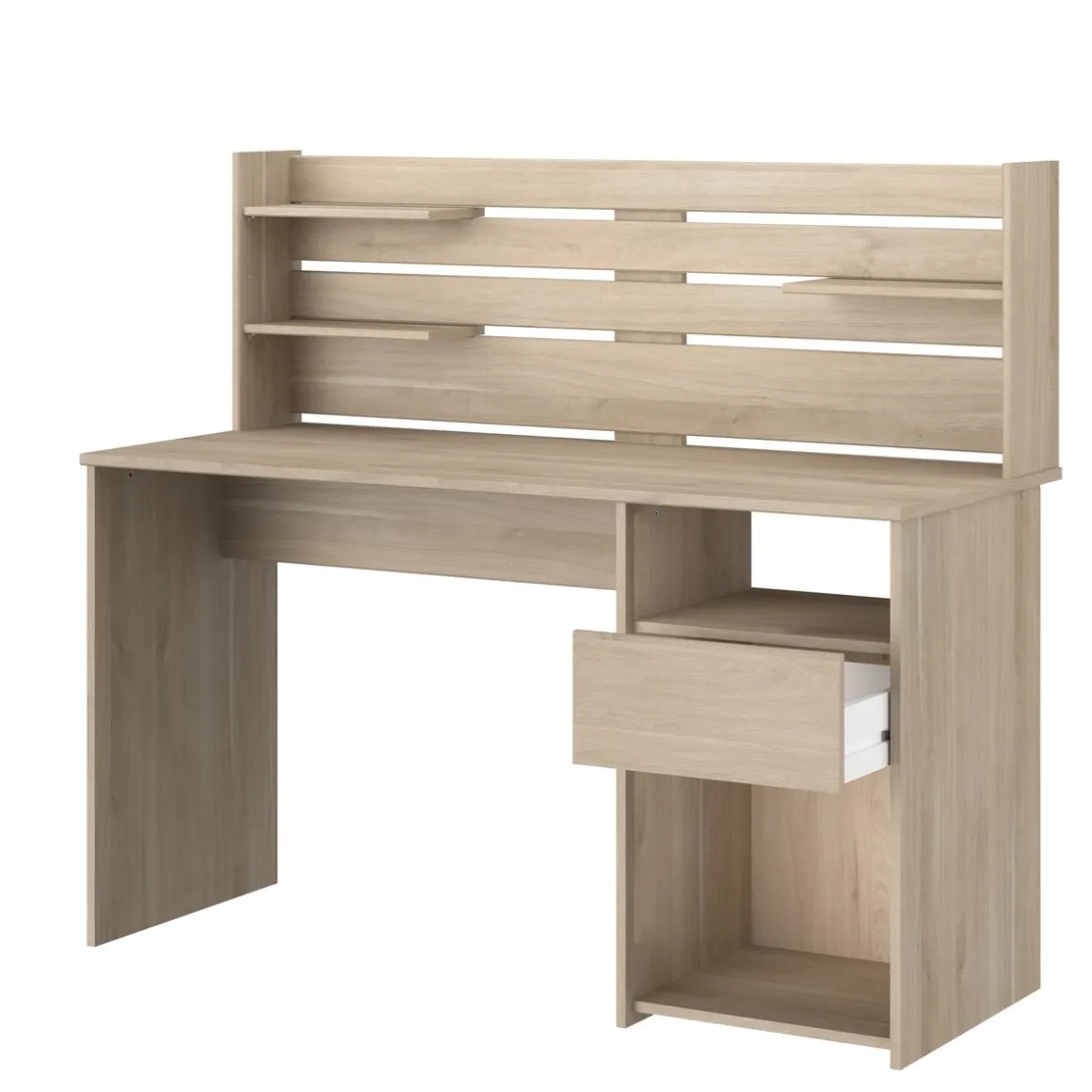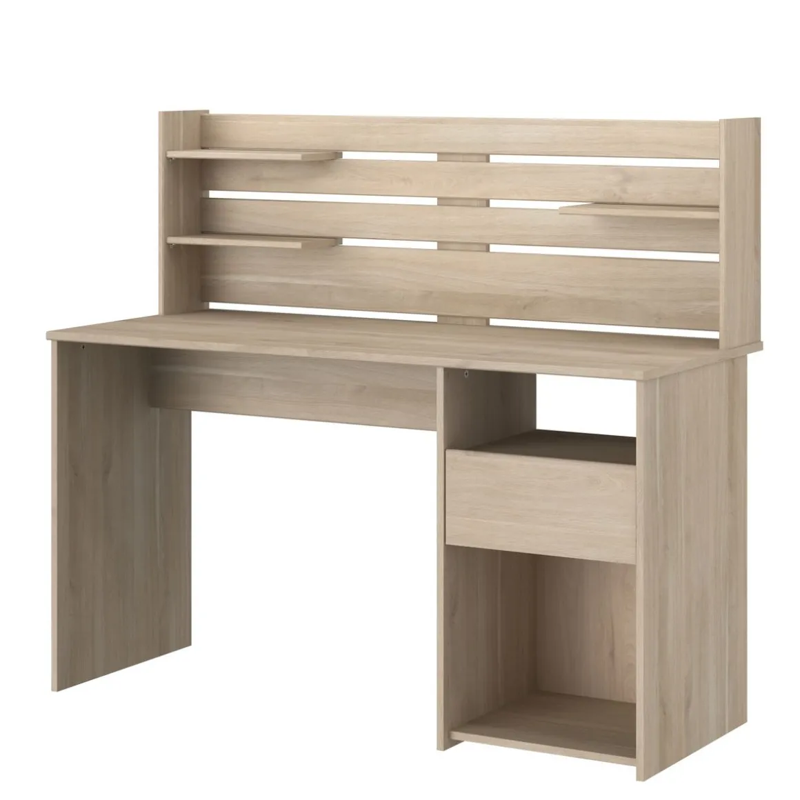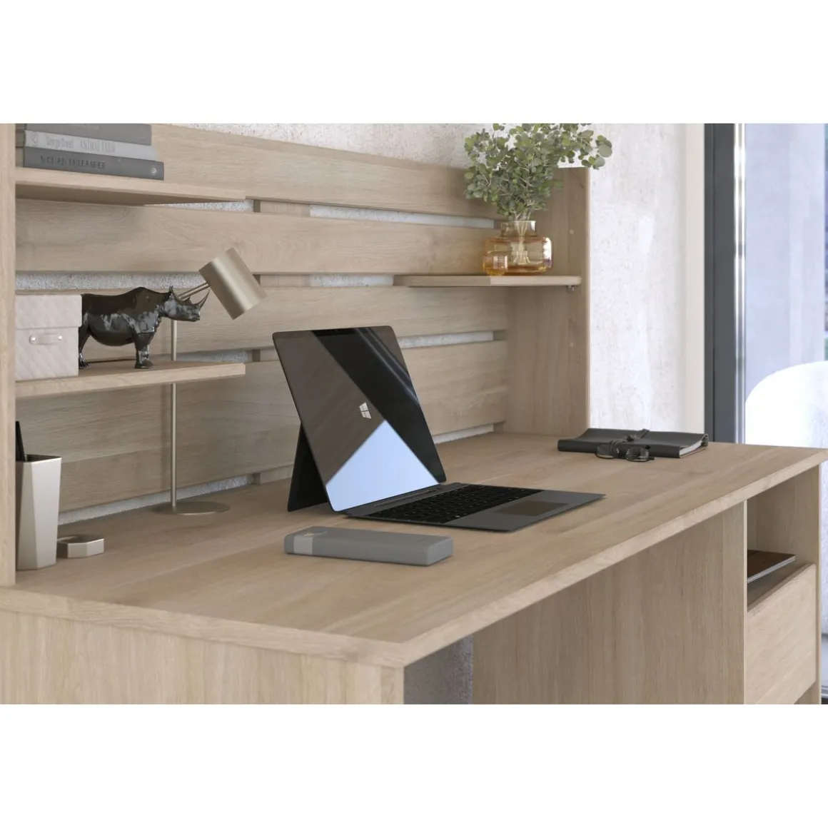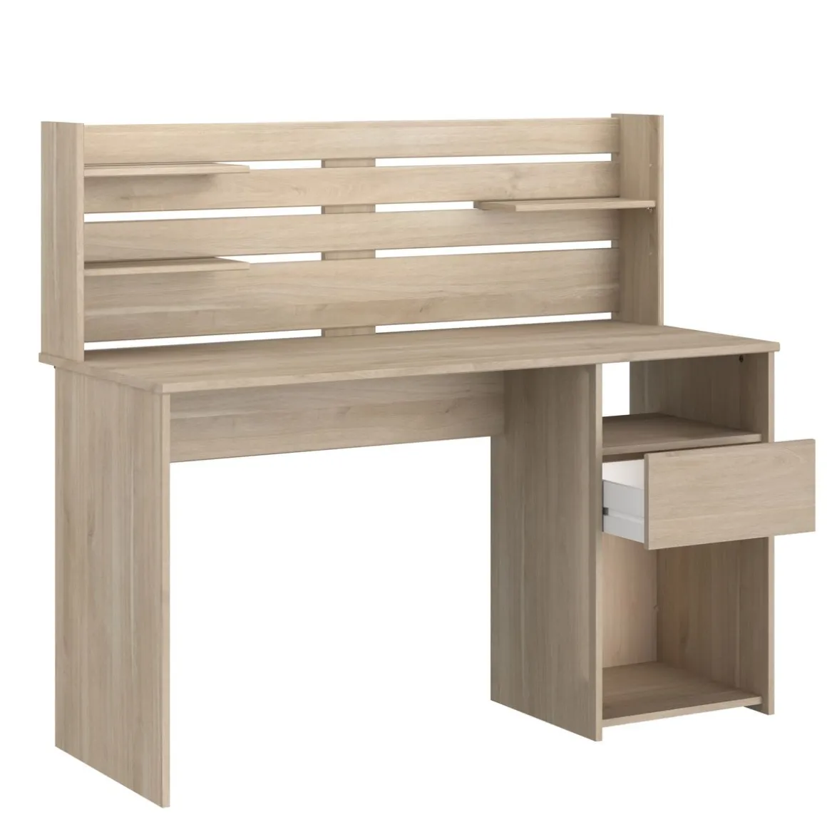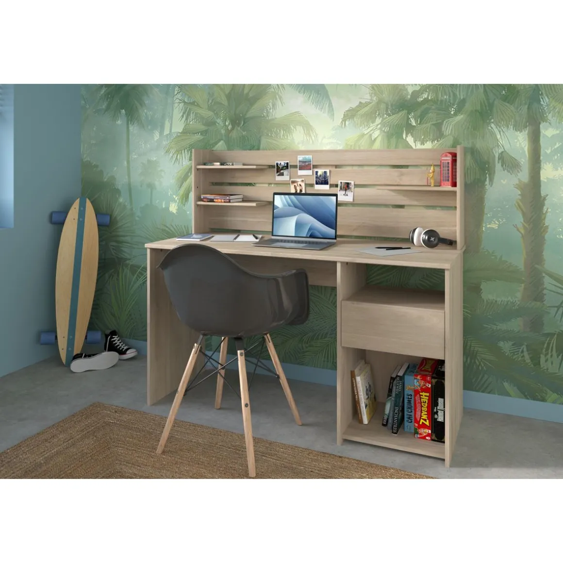 Le bureau droit PIA en imitation chêne est conçu pour offrir un espace de travail spacieux, idéal pour accueillir de grands écrans d’ordinateurs. Grâce à ses nombreux rangements, il est parfait pour organiser vos fournitures avec ses 3 tablettes amovibles, 1 tiroir et 2 niches. Les tablettes sont ajustables en 6 positions pour personnaliser l’aménagement selon vos besoins.