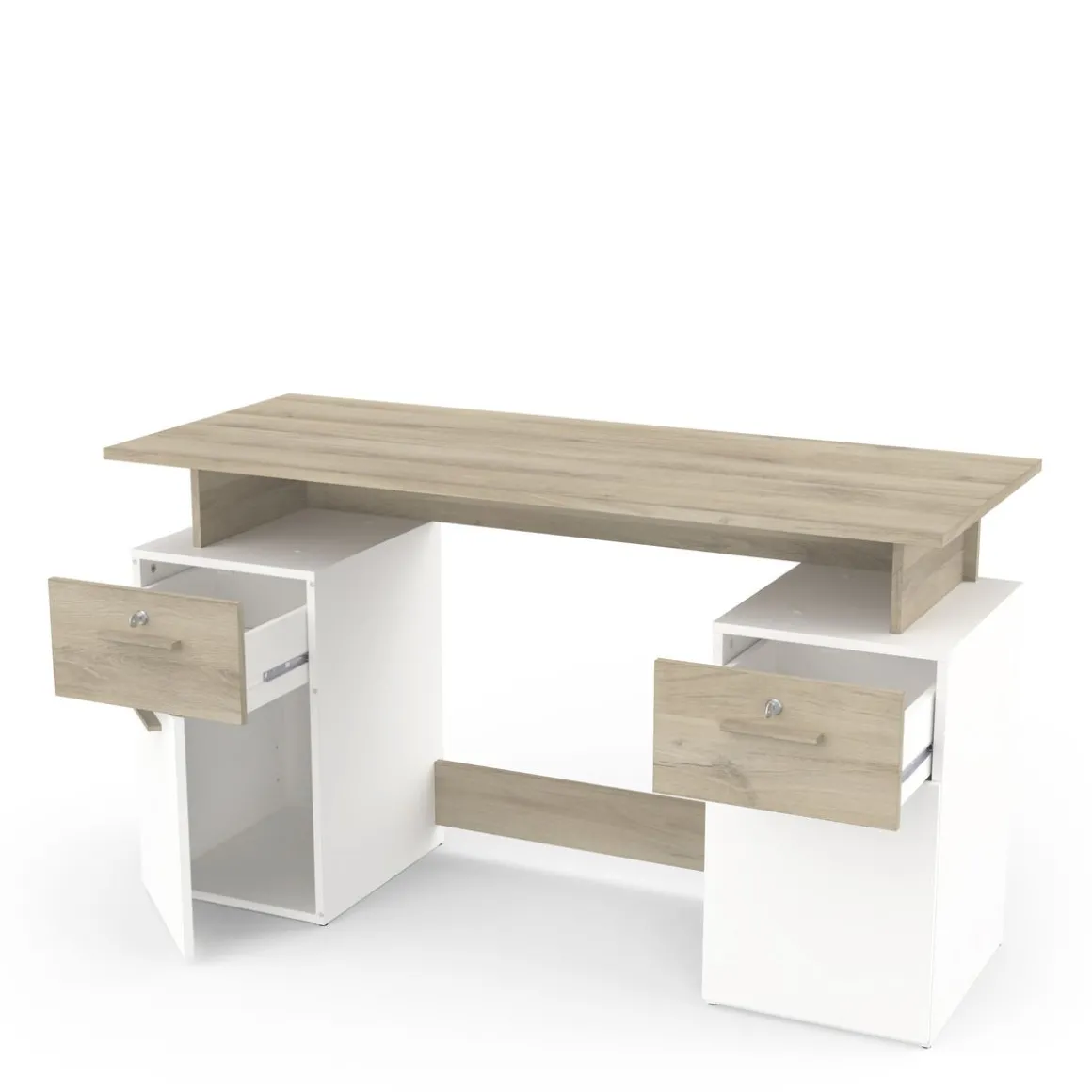 Panneaux de particules, épaisseur 15mm. Décor papier chêne kronberg sur les tiroirs et sur-meuble, décor papier blanc mat pour les 2 portes. Plateau du dessus, épaisseur 18mm, charge max. 30kg. 2 niches fermées : dim. utiles 31,3 x 38,9 x 41,3cm. 2 tiroirs sur coulisses à billes : dim. utiles 28 x 38,7 x 10,6cm, charge max. 2kg. 2 serrures avec 1 jeu de 2 clés pour chacune. Poignée barrette laquée chêne kronberg. »