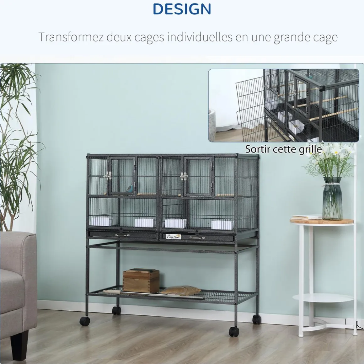 – La grille du milieu peut être retirée pour transformer les 2 cages individuelles en une grande cage