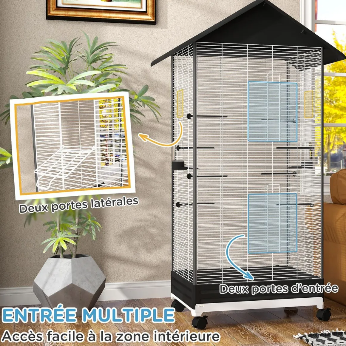 – Cette cage pour oiseaux sur pied comprend deux mangeoires et huit perchoirs pour l’enrichissement des oiseaux