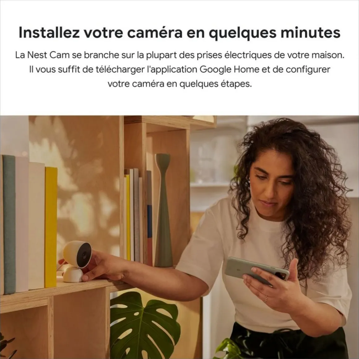 La Nest Cam se branche sur la plupart des prises électriques de votre maison. Il vous suffit de télécharger l’application Google Home et de configurer votre caméra en quelques étapes.