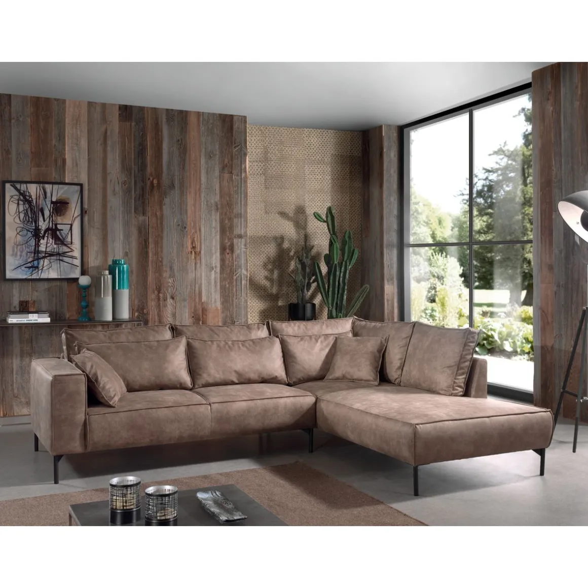 Le style vintage est mis en avant avec ce splendide canapé d’angle droit ! Son coloris marron vieilli est original et ses pieds en métal design lui donne un aspect très contemporain. Ne lésinant pas sur le confort, il offre 4 bonnes places.