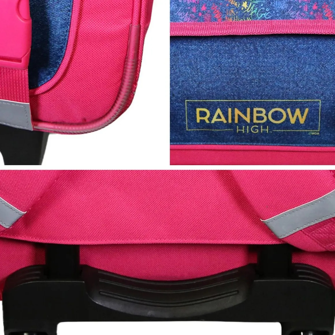 *STYLE COLORÉ AVEC RAINBOW HIGH* Préparez la rentrée avec le cartable à roulettes Rainbow High Multicolore. Ses couleurs éclatantes et son design tendance feront tourner les têtes dès le premier jour. Parfait pour ajouter une touche de magie à l’école.*SOLIDITÉ À TOUTE ÉPREUVE* Ce cartable est fabriqué en polyester de qualité supérieure, offrant une robustesse et une durabilité inégalées. Il est conçu pour résister aux rigueurs du quotidien, garantissant une utilisation prolongée sans souci.*TAILLE PARFAITE*