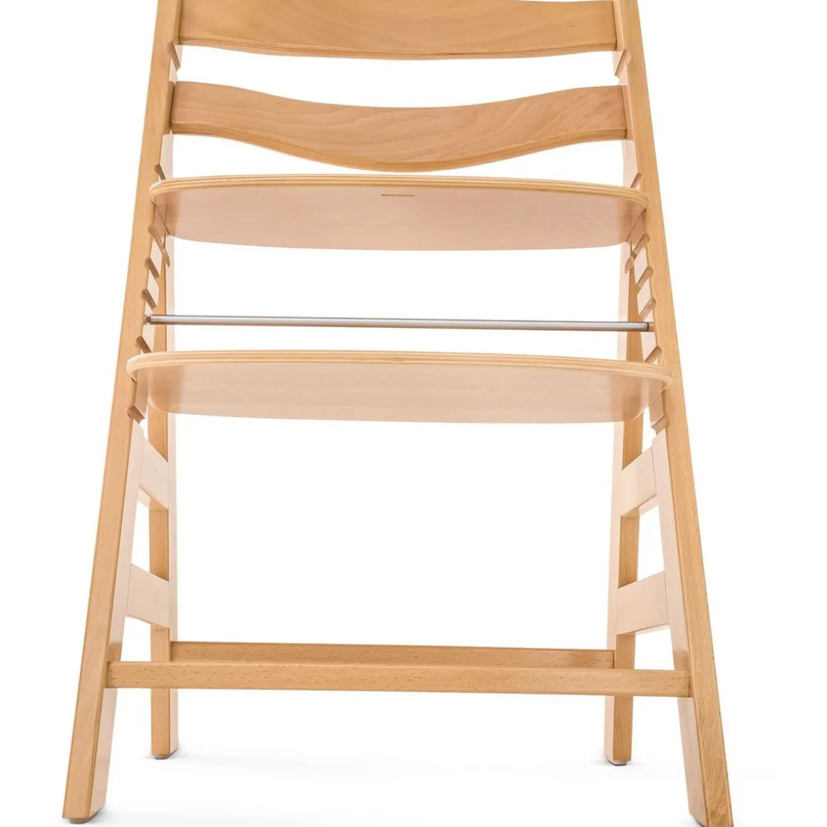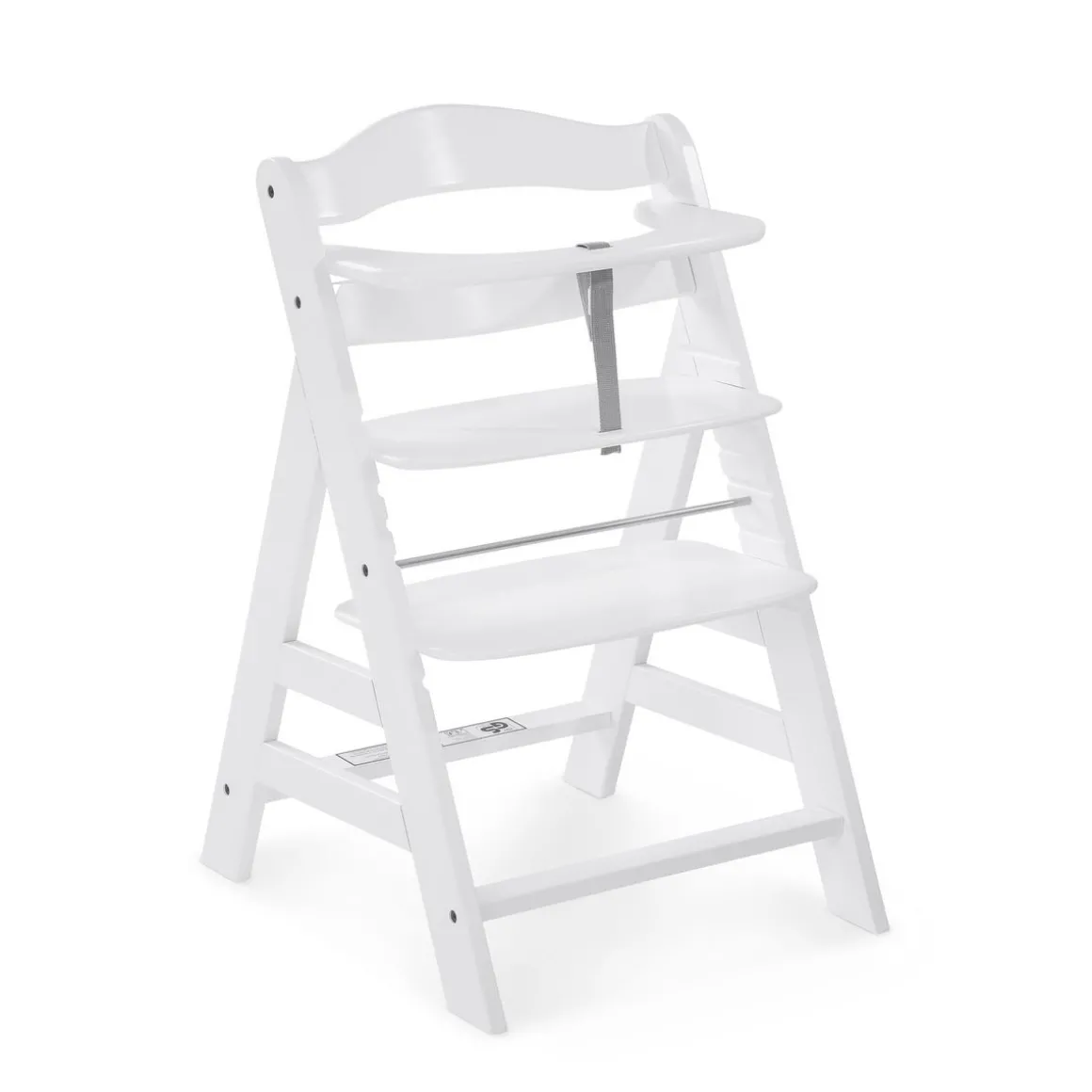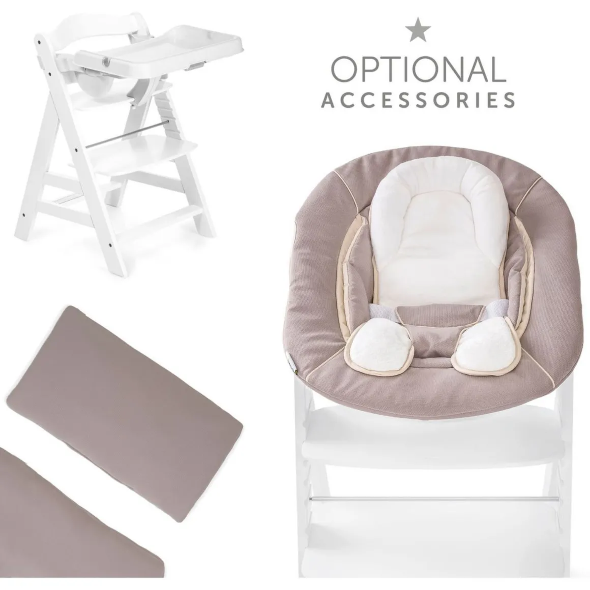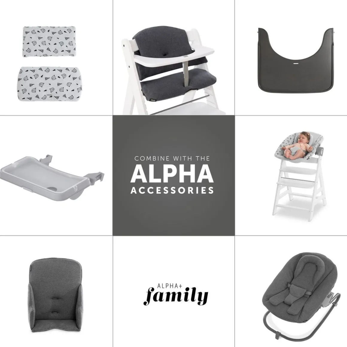 Notre recommandation : En combinaison avec le transat Alpha Bouncer vous pouvez utiliser la chaise haute ALPHA+ dès la naissance de votre bébé. Elle se peut combiner également avec les différents coussins d’assise, la table en bois Alpha Wooden Tray ou avec la table réglable Alpha Tray. »